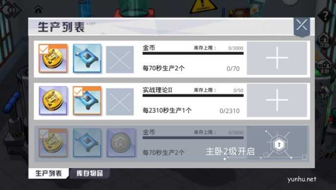 2、宿舍的【厨房】可以进行【生产】。指挥官们可以派遣【未在编队中】的潘多拉进行生产,初级产物可选择【金币】或者【实战理论II】。当主卧等级提高后,还会有更多类型的产物可以选择!