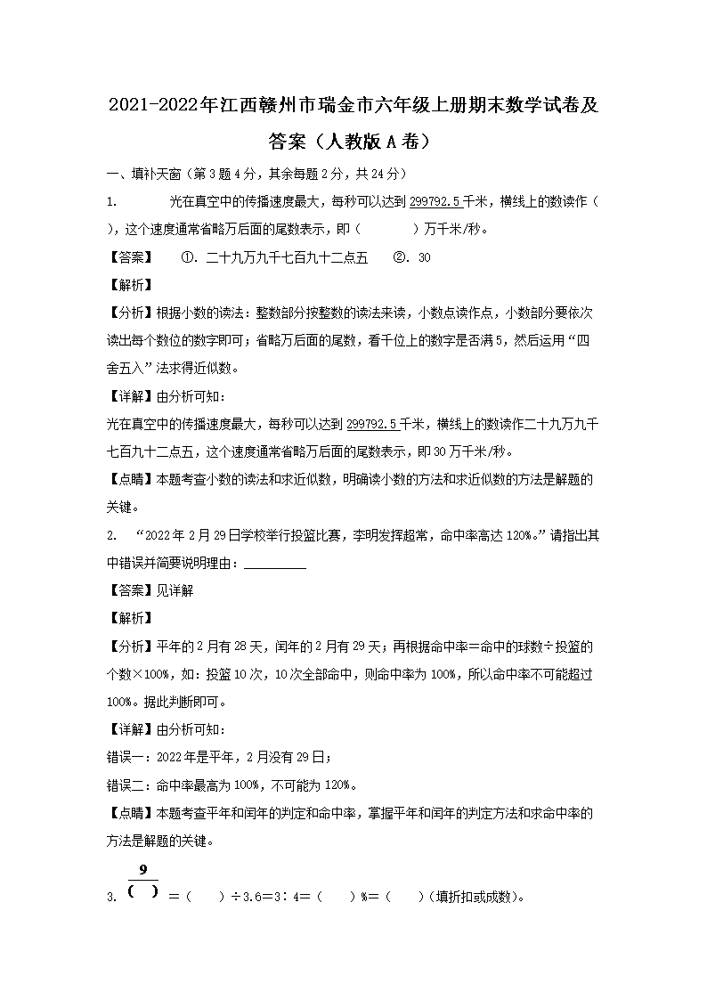 【文档预览】 文档大全网整理发布2021-2022年江西赣州市瑞金市六年级上册期末数学试卷及答案(人教版A卷)(Word版),前五页预览如下: