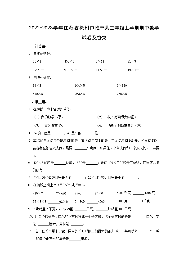 【文档预览】 文档大全网整理发布2022-2023学年江苏省徐州市睢宁县三年级上学期期中数学试卷及答(Word版),前五页预览如下:
