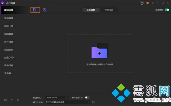 2.在你的电脑上启动万兴优转,点击左上角添加文件图标,并导入你想要转换的视频;