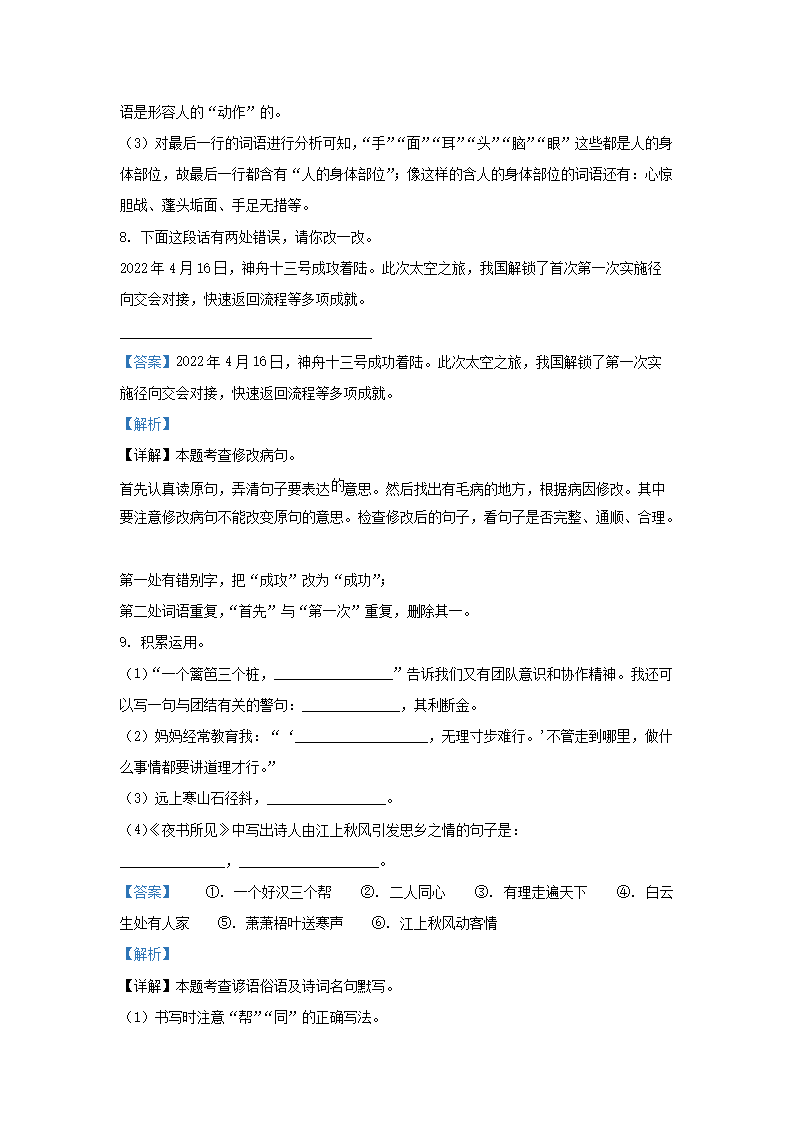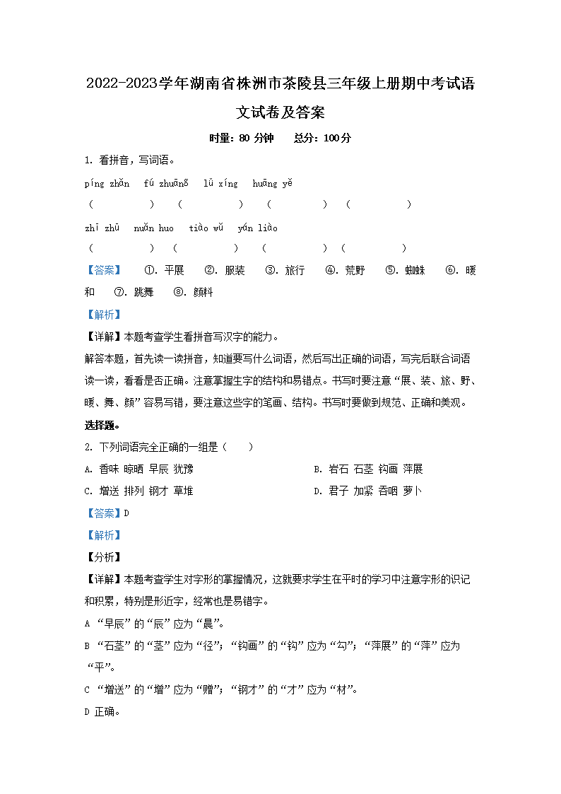2022-2023学年湖南省株洲市茶陵县三年级上册期中考试语文试卷及答案(Word版)09-26