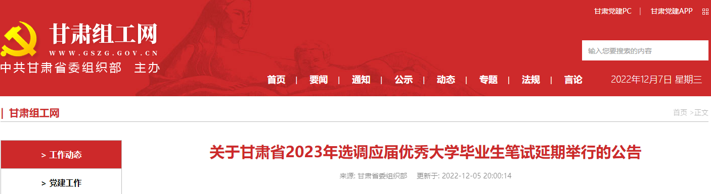 经研究,原计划于12月18日举行的甘肃省2023年选调生笔试延期进行,具体时间另行通知。