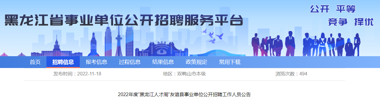 在友谊县政府、黑龙江事业单位公开招聘服务平台发布《2022年度“黑龙江人才周”友谊县事业单位公开招聘工作人员公告》。
