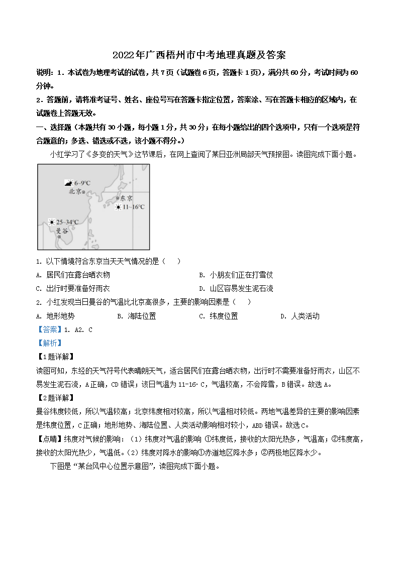 2022年广西梧州市中考地理真题及答案(Word版)05-31