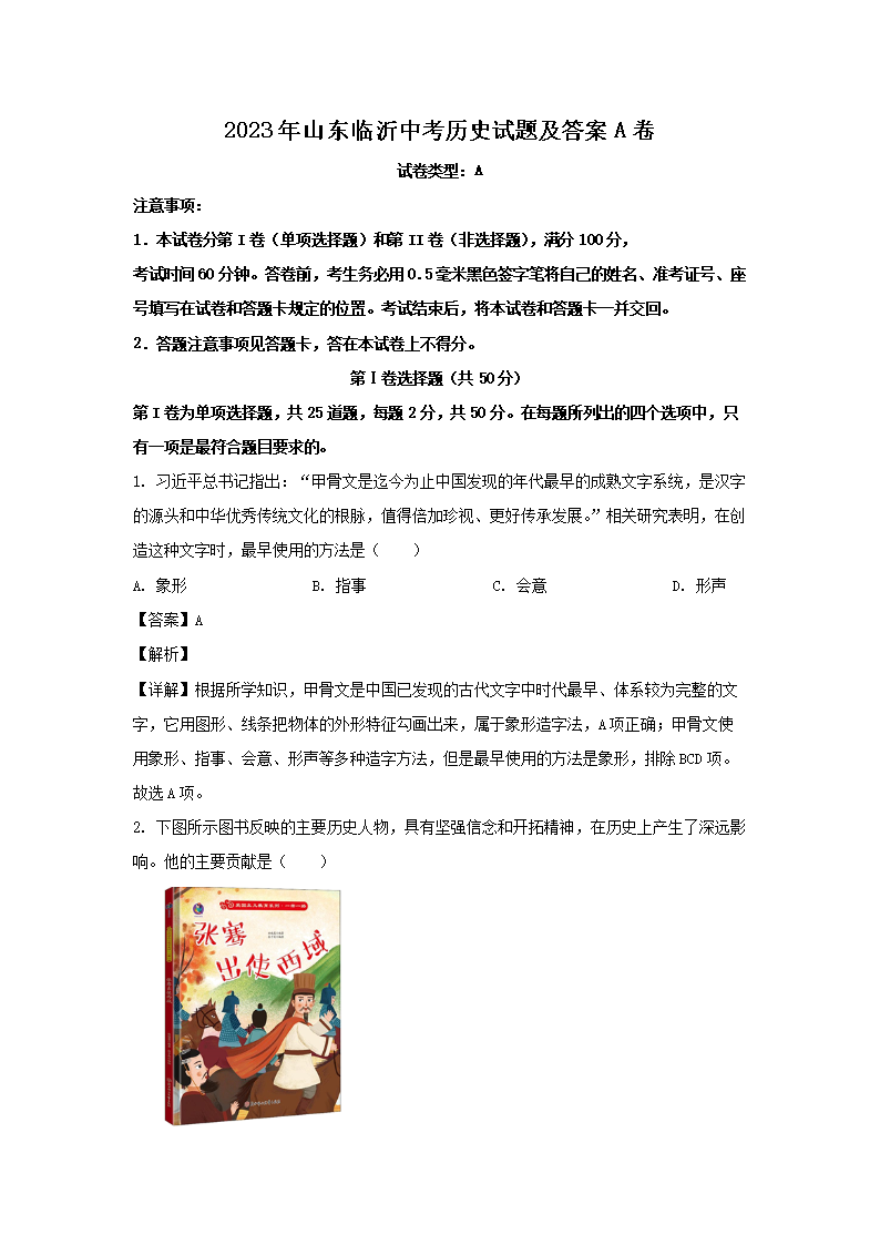 【文档预览】 文档大全网整理发布2023年山东临沂中考历史试题及答案A卷(Word版),前五页预览如下: