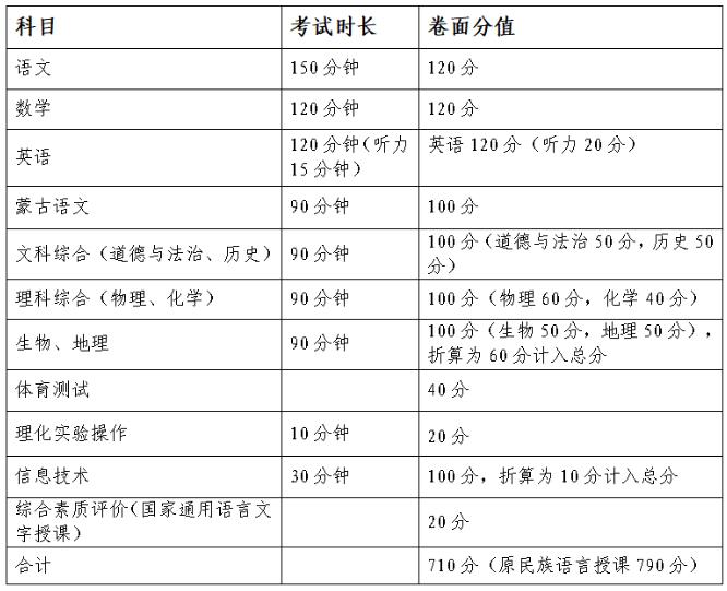 2020年秋季入学的九年级学生:初中学业水平考试科目为语文、数学、英语、文科综合(道德与法治、历史)、理科综合(物理、化学)共5卷7科,以及物理(化学)实验操作、信息技术、体育、音乐、美术。原民族语言授课考生加试蒙古语文。