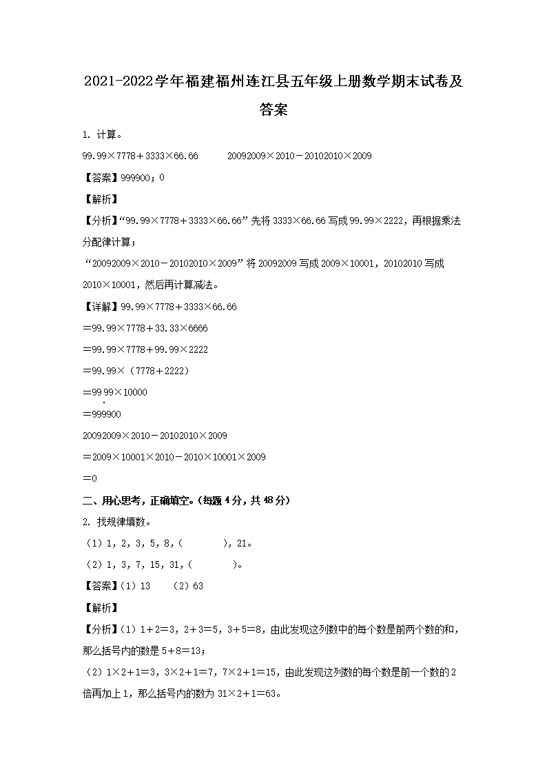 2021-2022学年福建福州连江县五年级上册数学期末试卷及答案(Word版)08-30