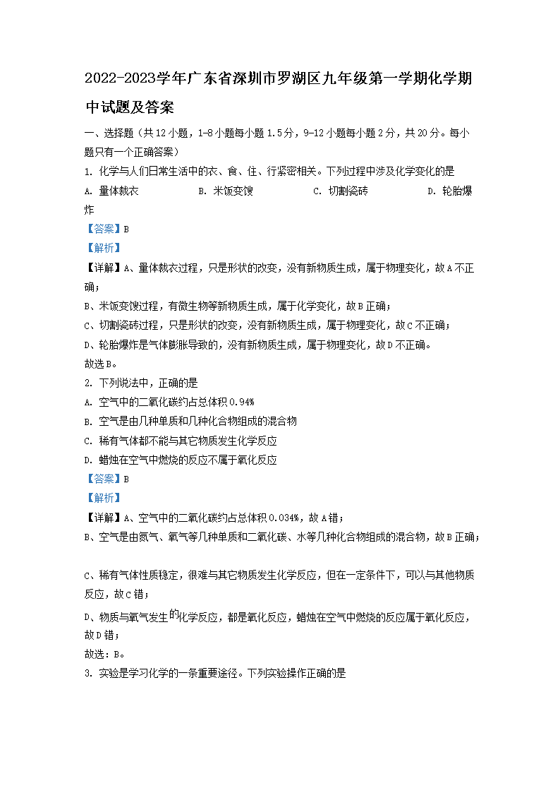 2022-2023学年广东省深圳市罗湖区九年级第一学期化学期中试题及答案(Word版)08-24