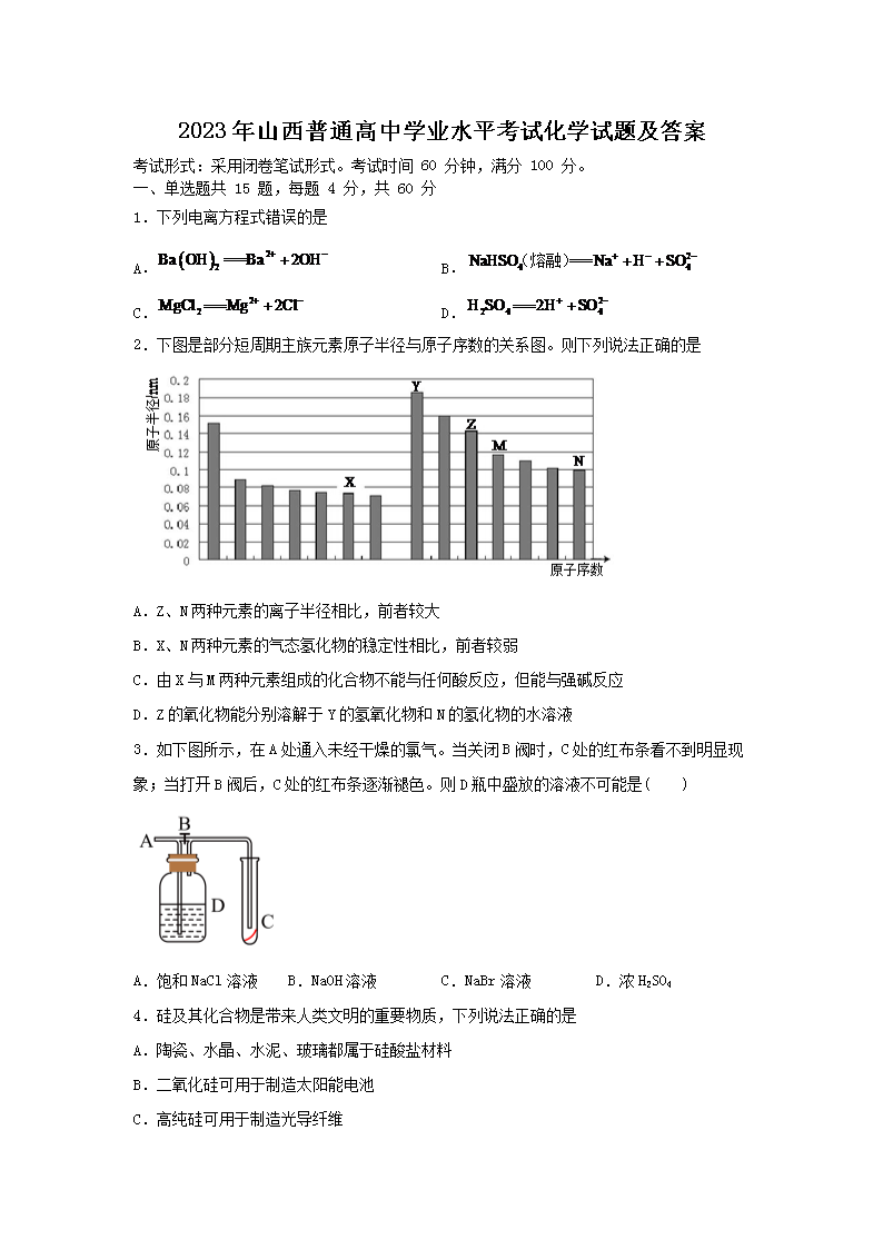 【文档预览】 文档大全网整理发布2023年山西普通高中学业水平考试化学试题及答案(Word版),前五页预览如下:
