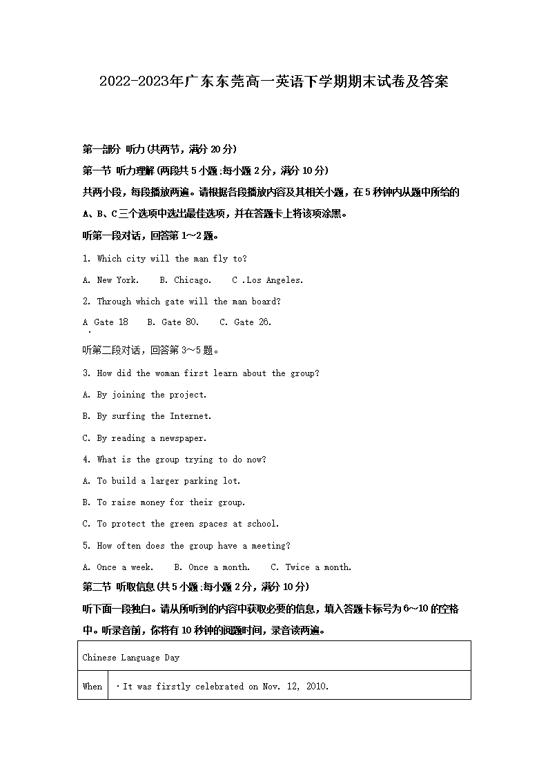 2022-2023年广东东莞高一英语下学期期末试卷及答案(Word版)10-20