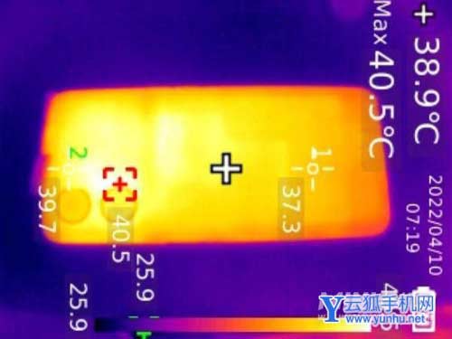 后盖最高温度为40.5℃,SoC区域紧挨着后摄,凸起区域温度都在40℃左右,而下方的机身温度则更低,中段38.9℃,底段则是37.3℃。