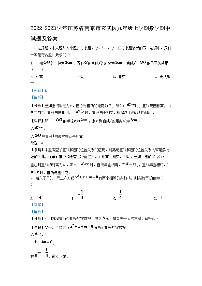 【文档预览】 文档大全网整理发布2022-2023学年江苏省南京市玄武区九年级上学期数学期中试题及答案(Word版),前五页预览如下: