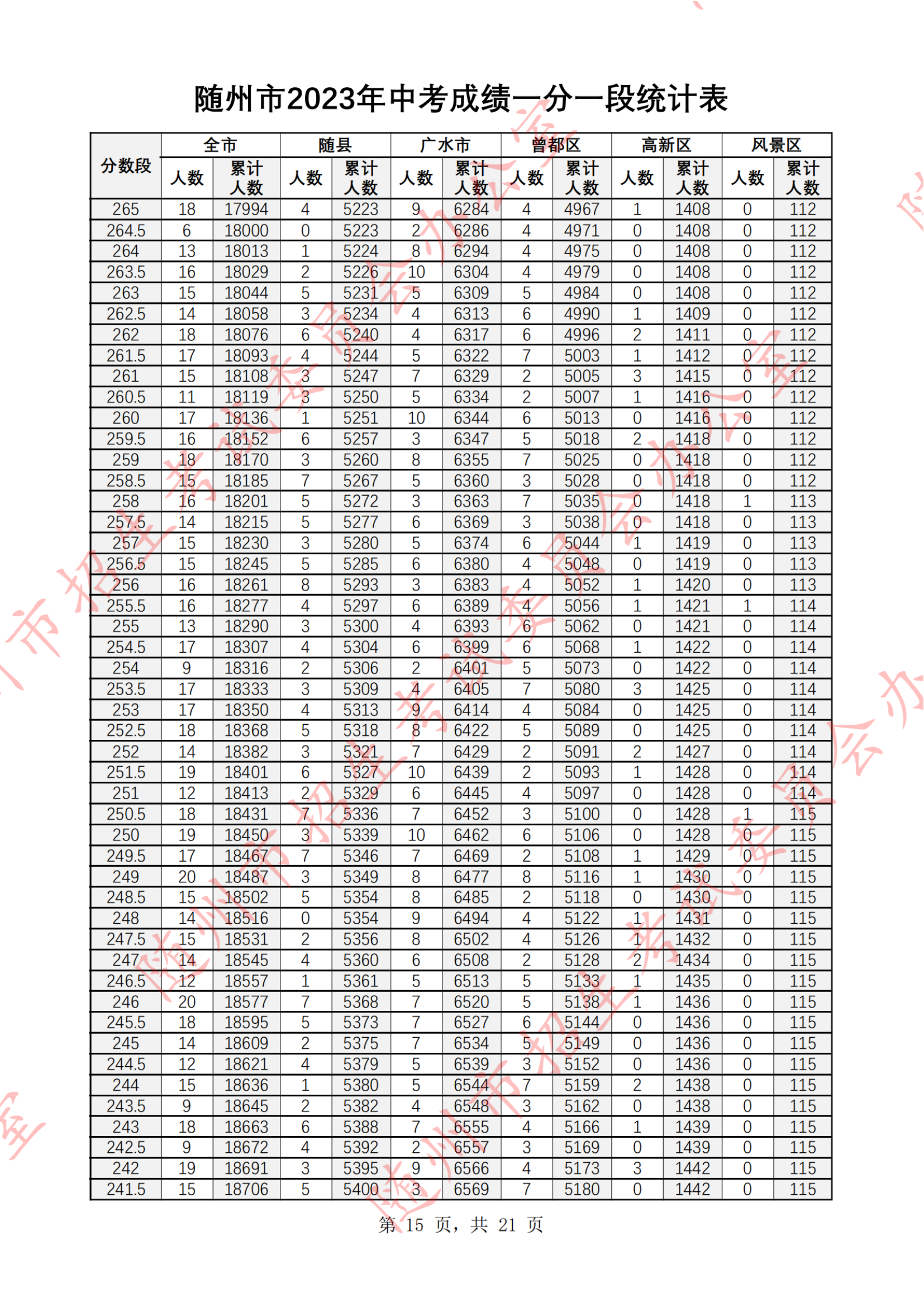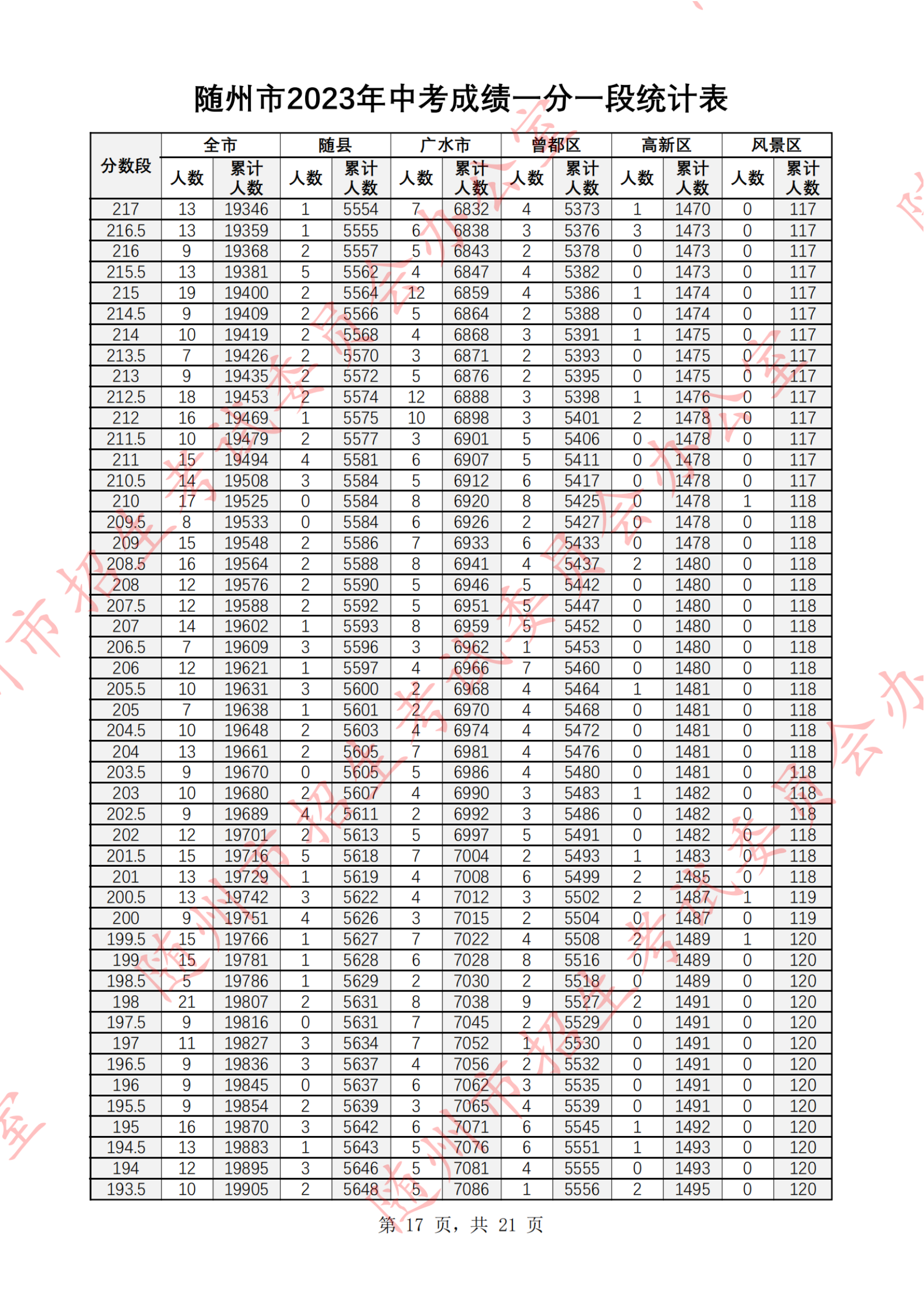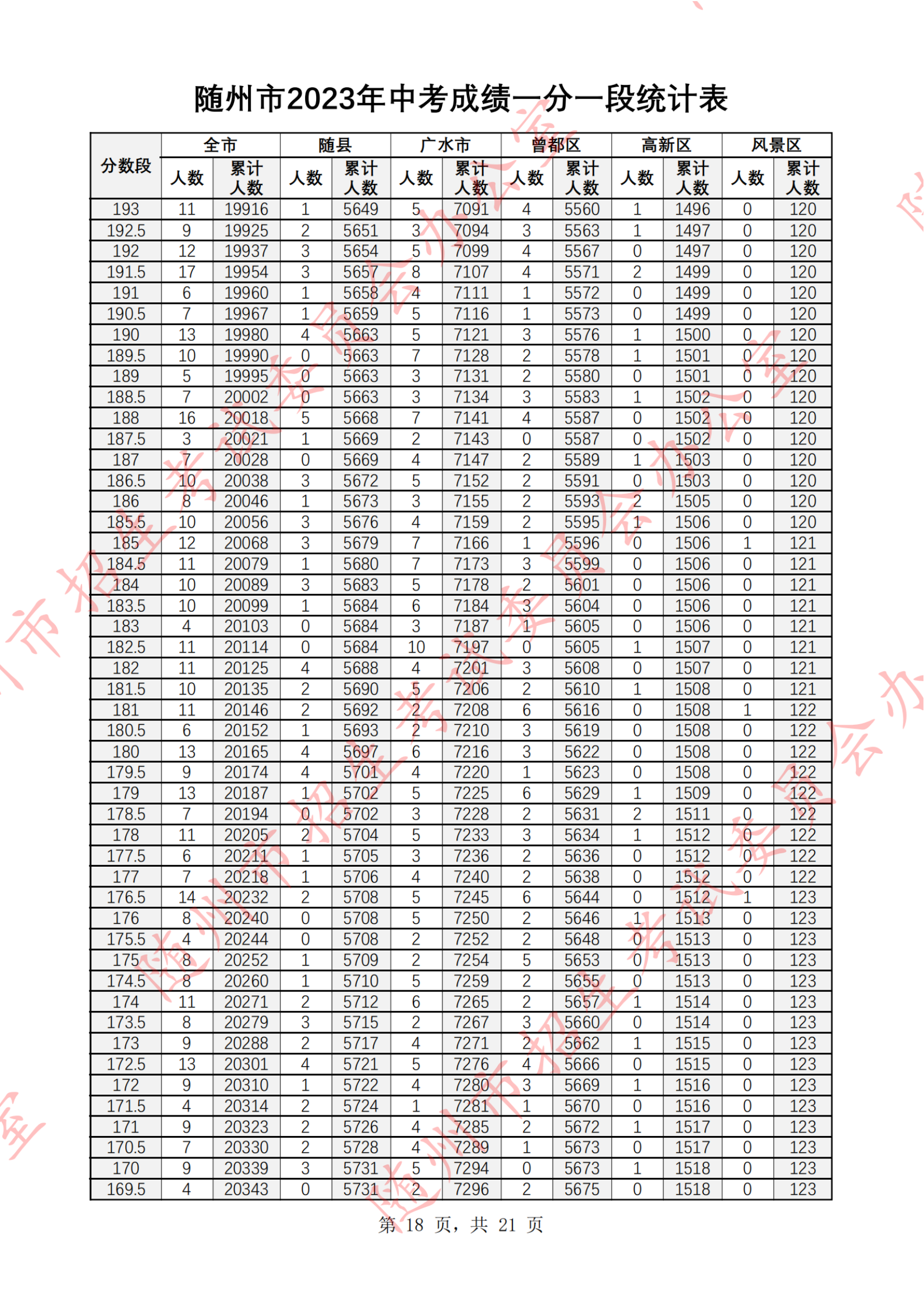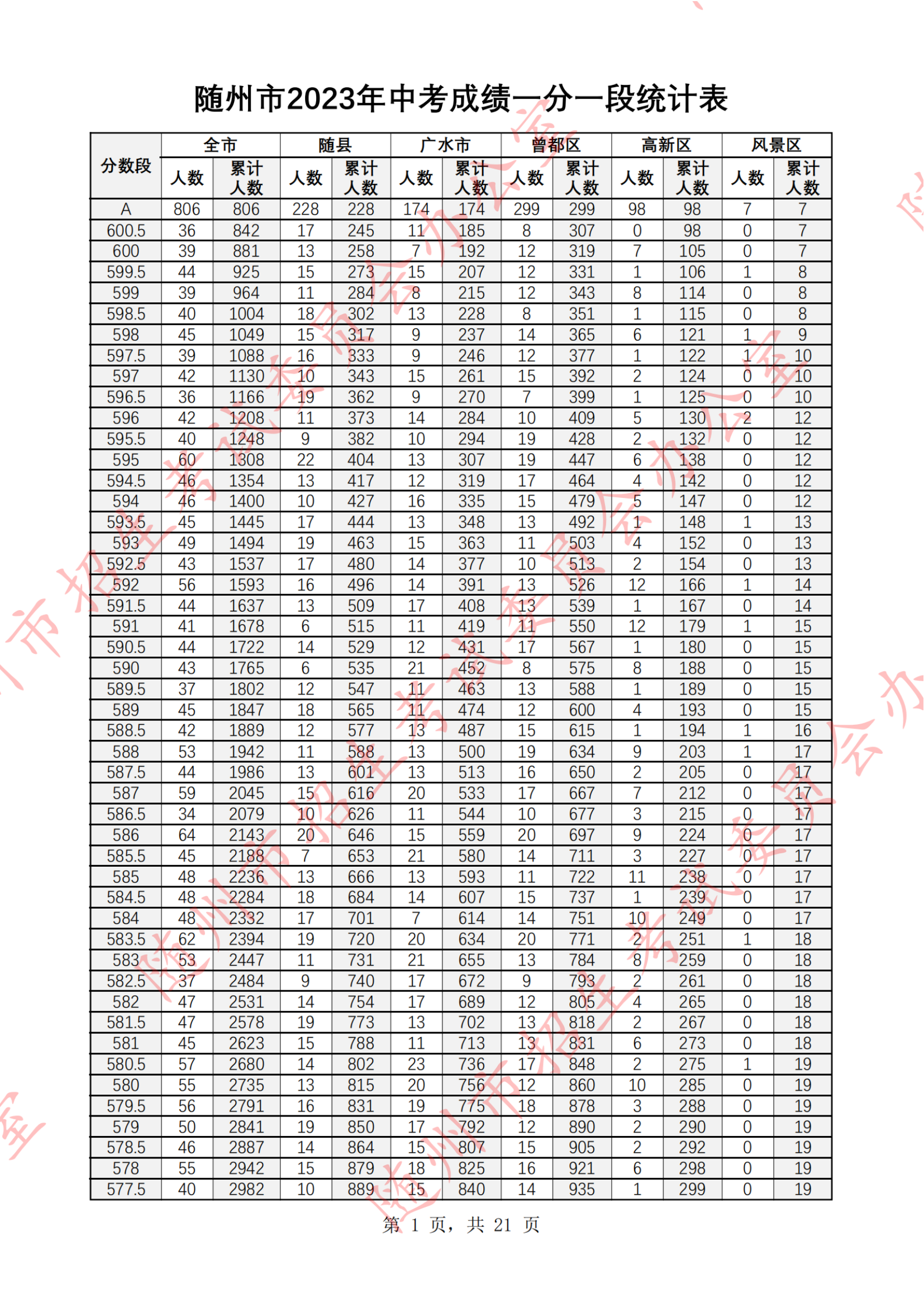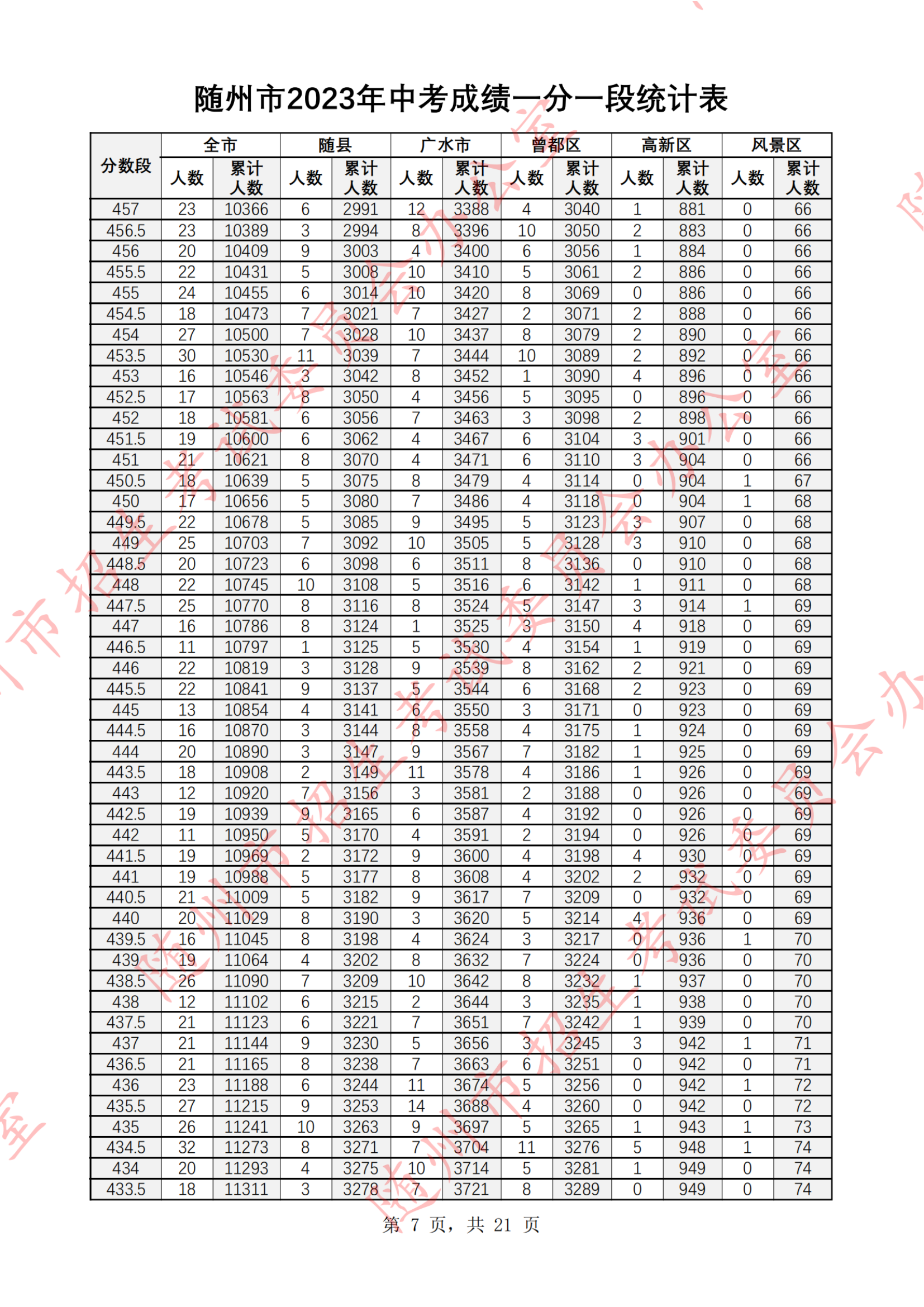 湖北随州2023年中考成绩一分一段统计表07-07