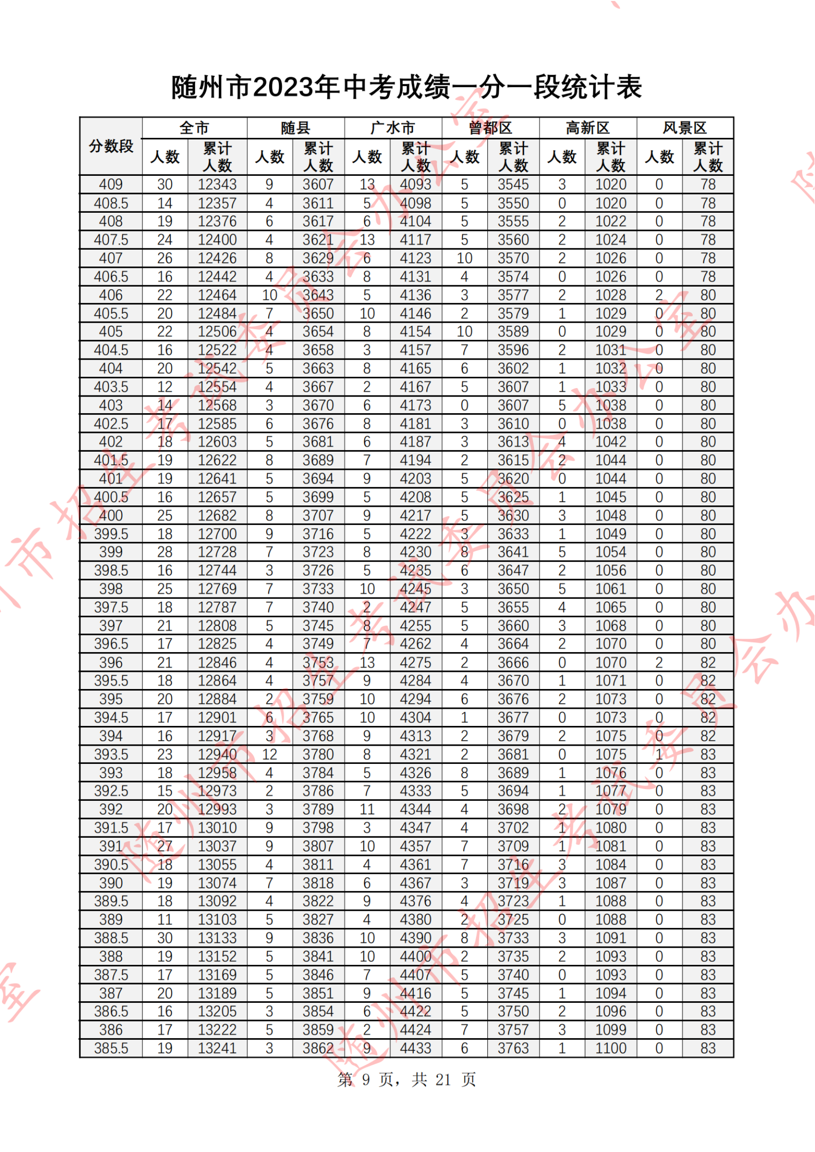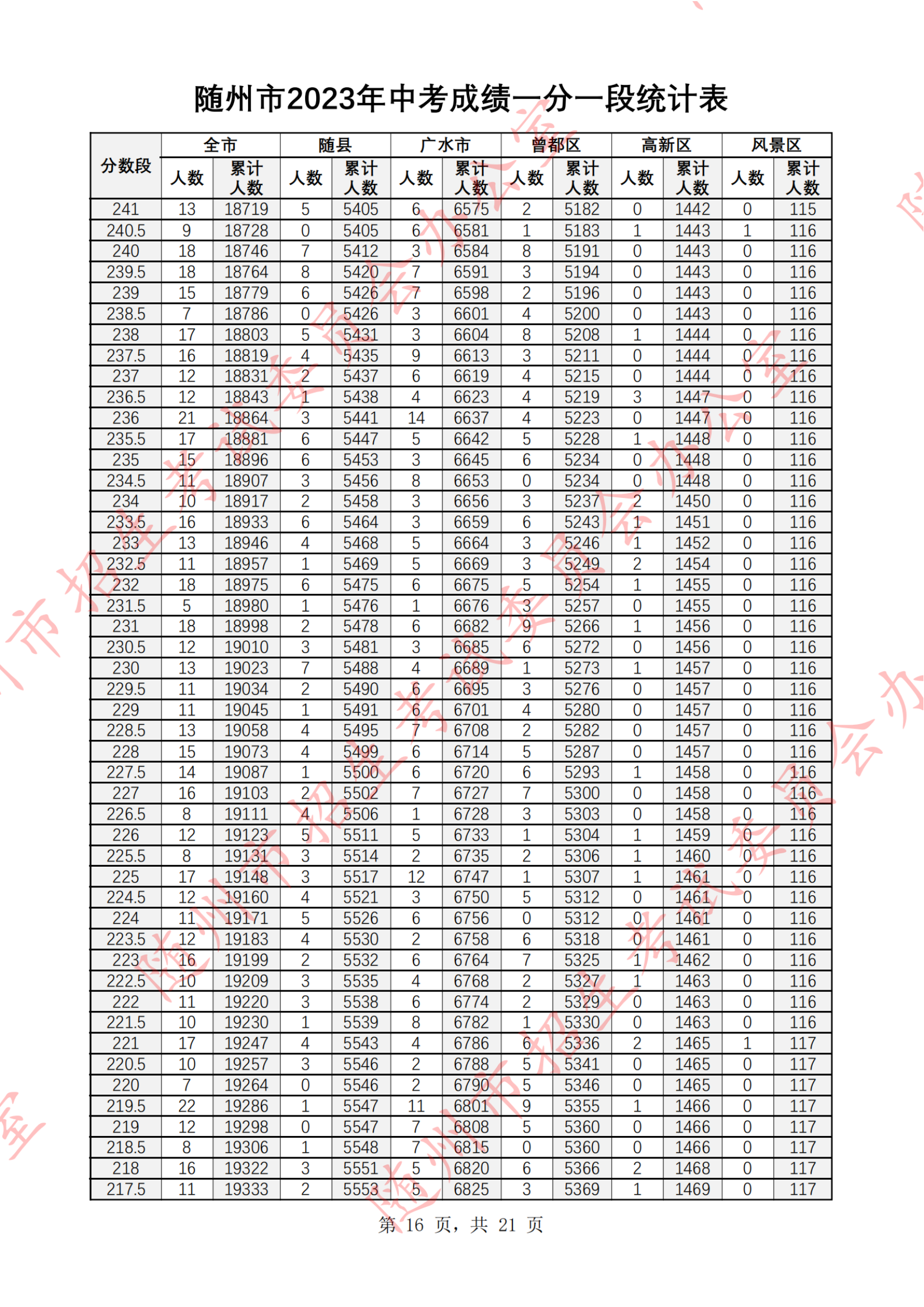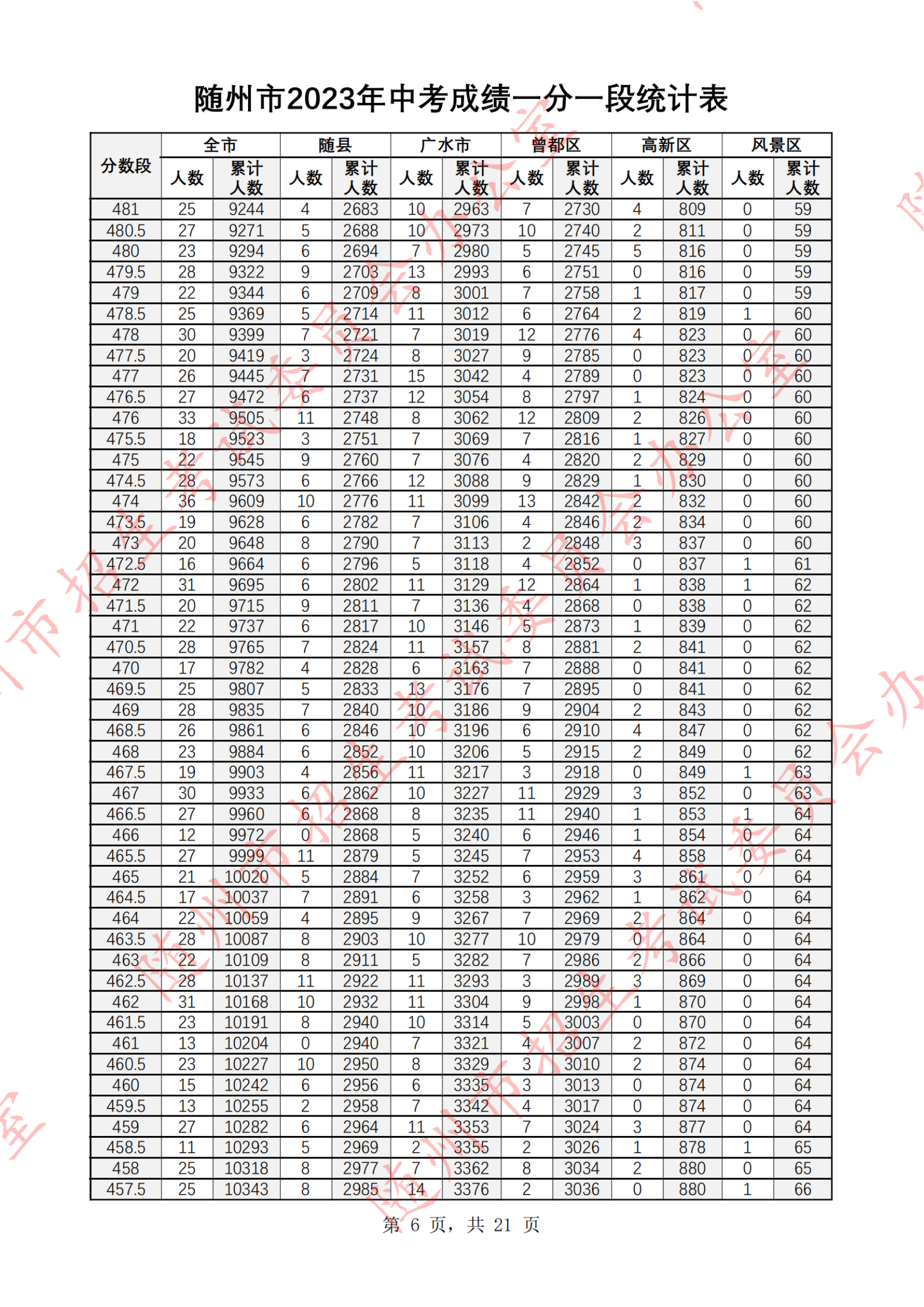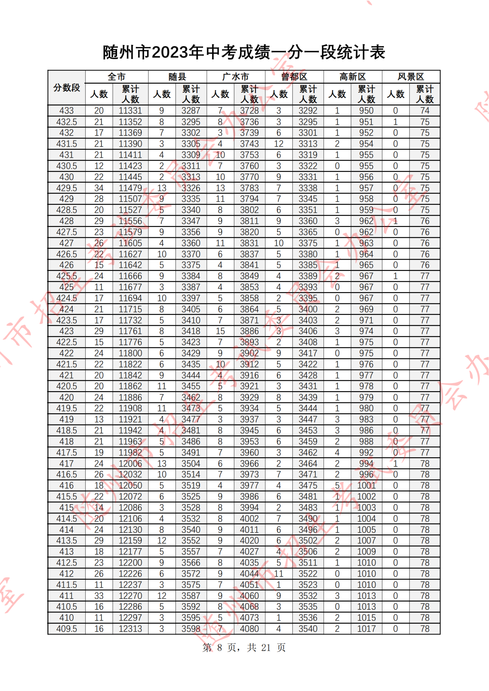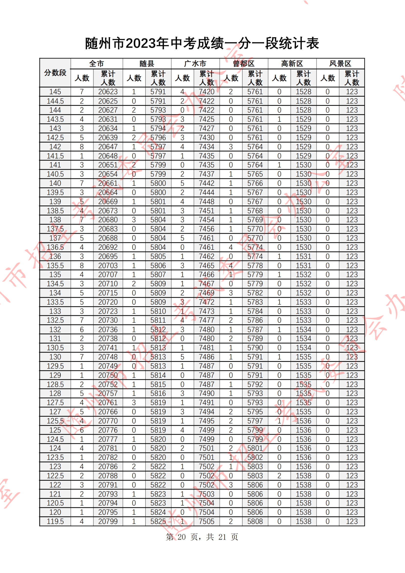 湖北随州2023年中考成绩一分一段统计表07-07