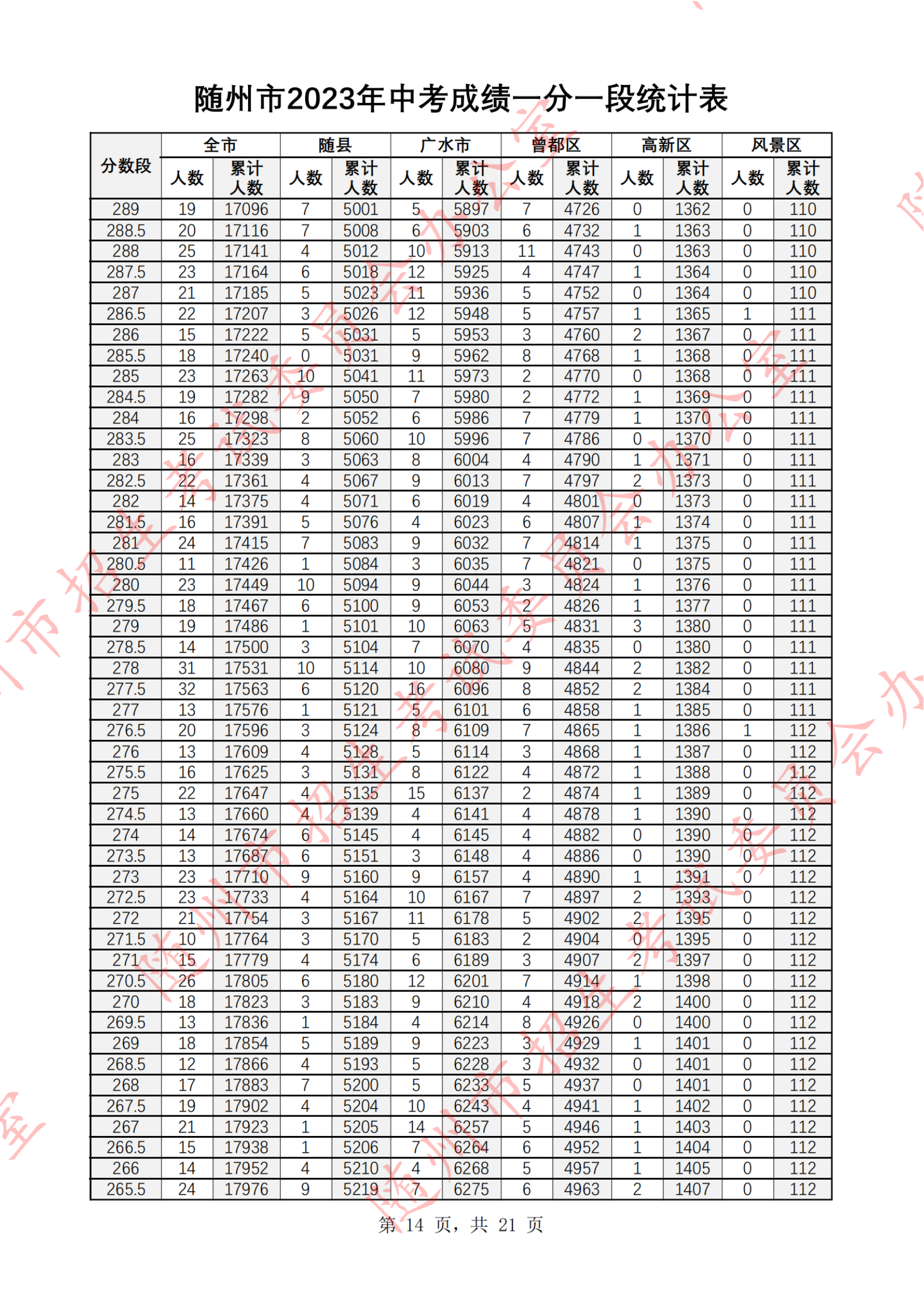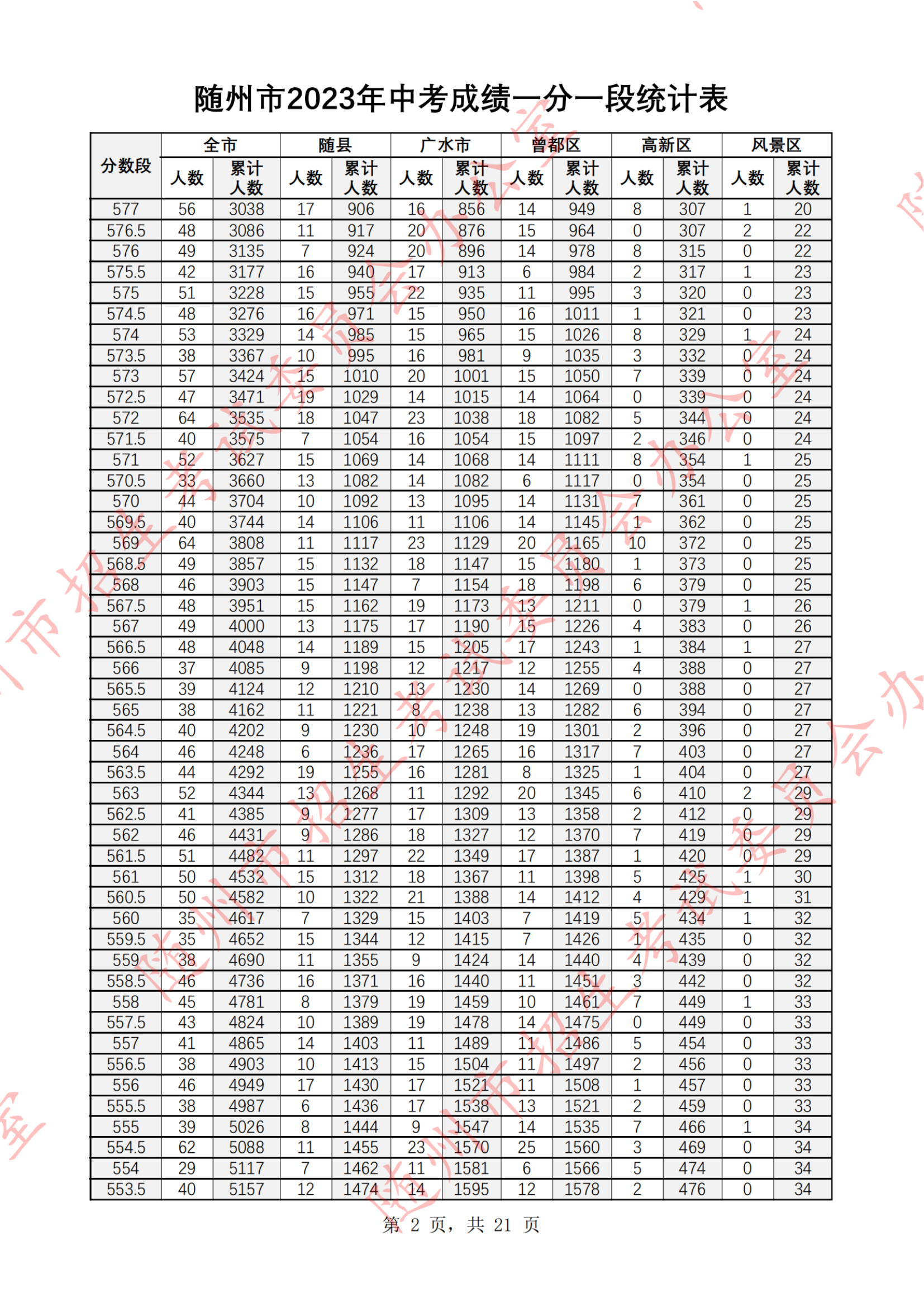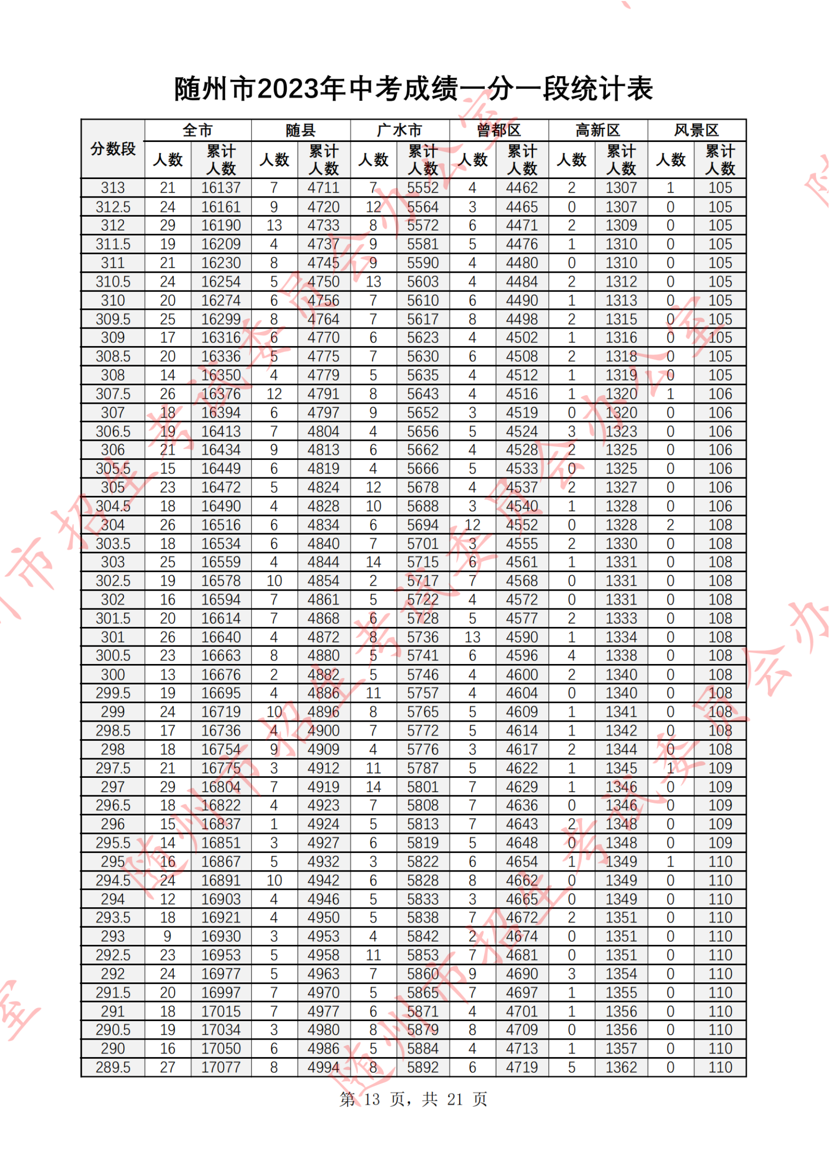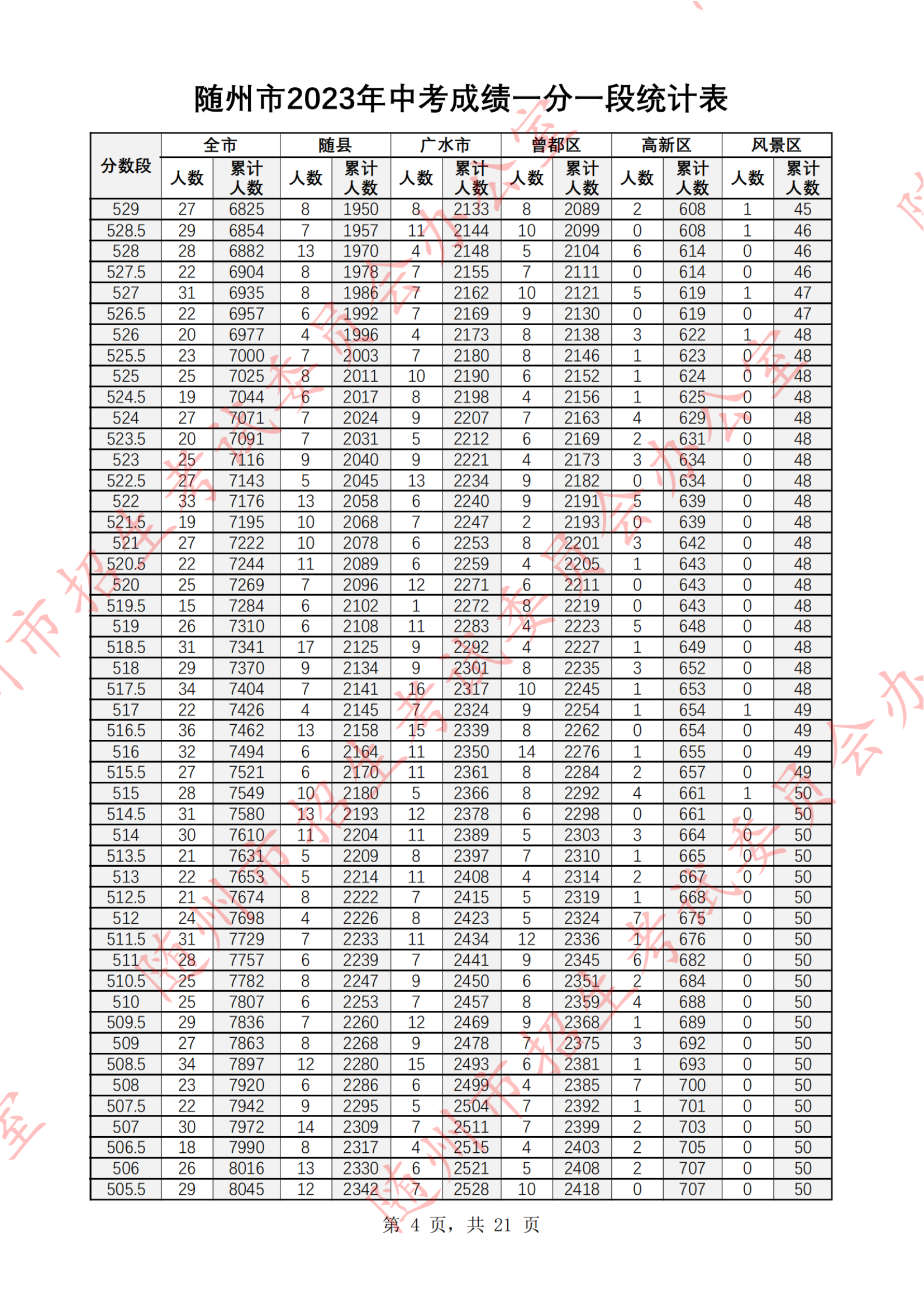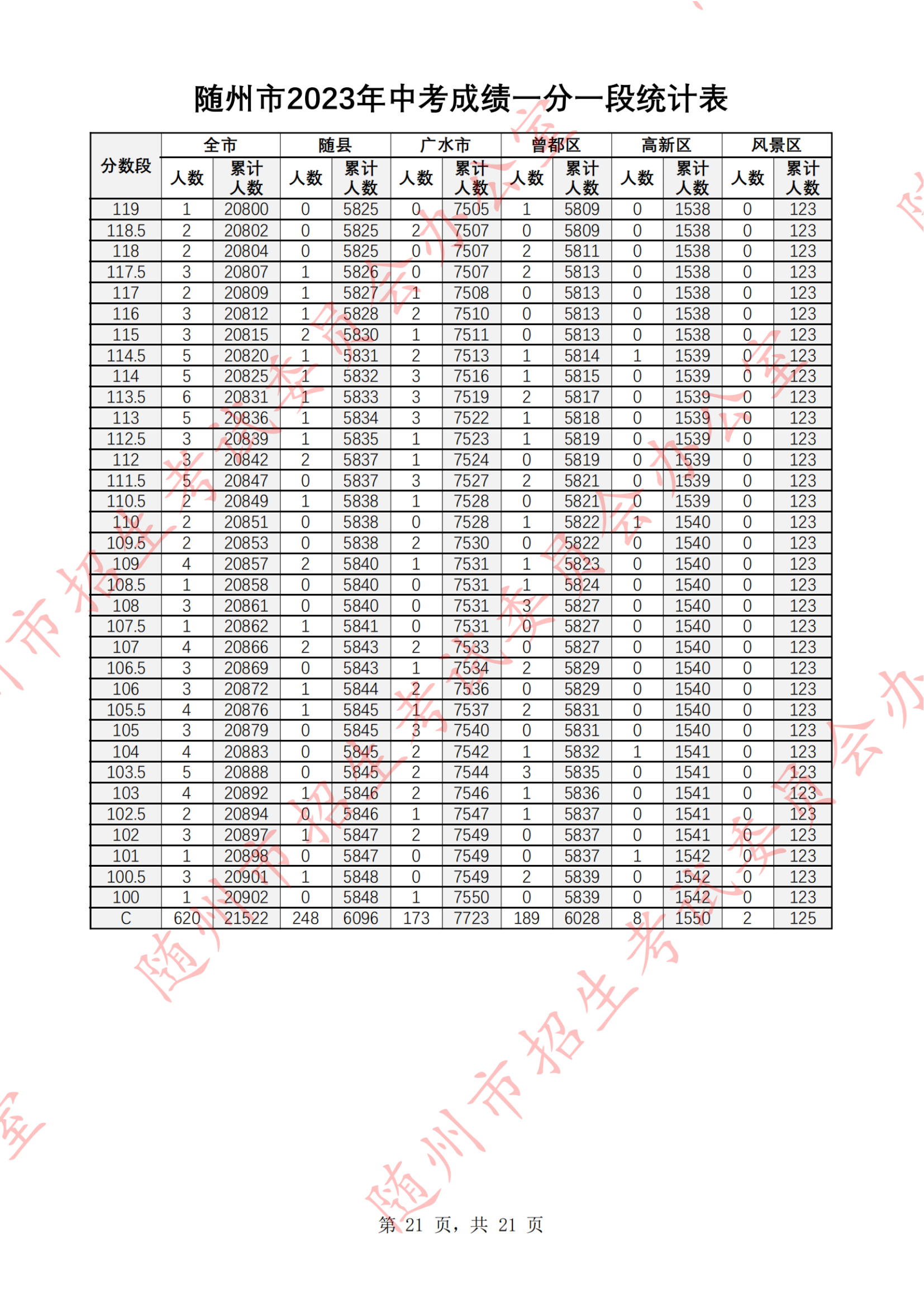 湖北随州2023年中考成绩一分一段统计表07-07