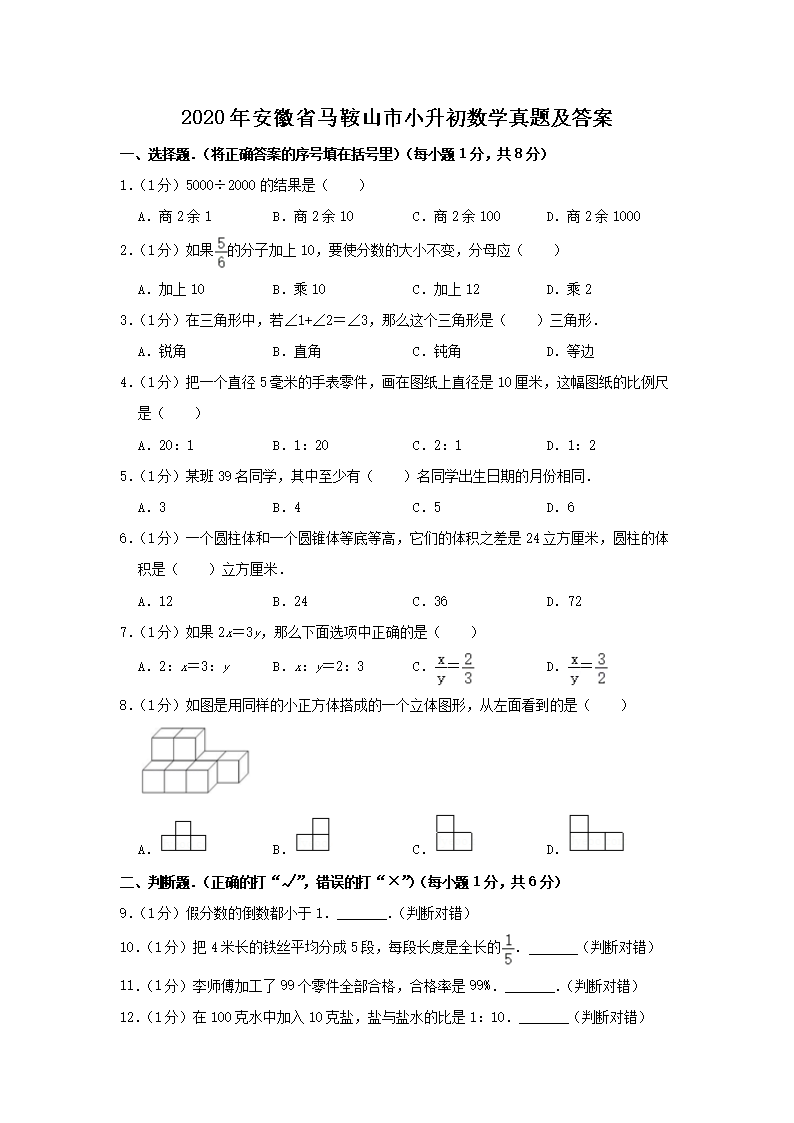 2020年安徽省马鞍山市小升初数学真题及答案(Word版)09-23