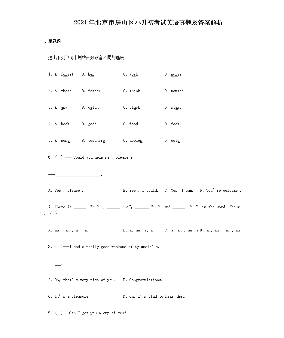 2021年北京市房山区小升初考试英语真题及答案解析(Word版)09-28