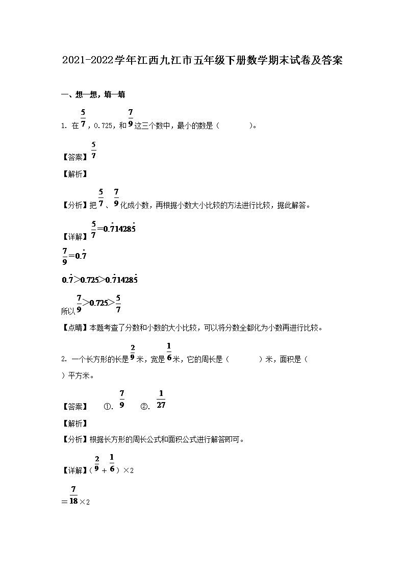 2021-2022学年江西九江市五年级下册数学期末试卷及答案(Word版)09-28