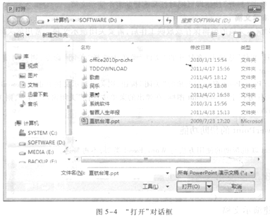 单击“文件”选项卡,在出现的菜单中选择“打开”命令,弹出“打开”对话框,如图5—4所示。在左侧窗格中选择存放目标演示文稿的文件夹,在右侧窗格列出的文件中选择要打开的演示文稿或直接在下面的“文件名”栏的文本框中输入要打开的演示文稿文件名,然后单击“打开”按钮即可打开该演示文稿。