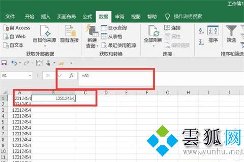 2、接着我们在b1单元格输入公式“=A1”;