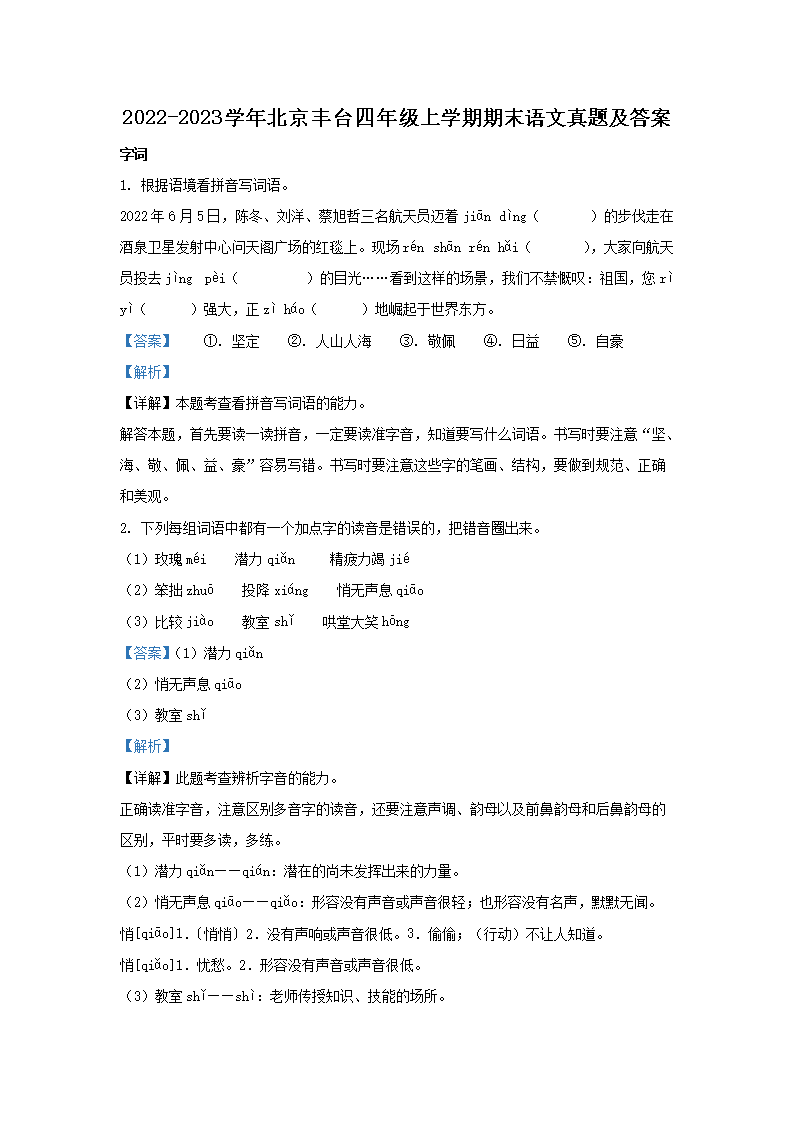 2022-2023学年北京丰台四年级上学期期末语文真题及答案(Word版)07-01