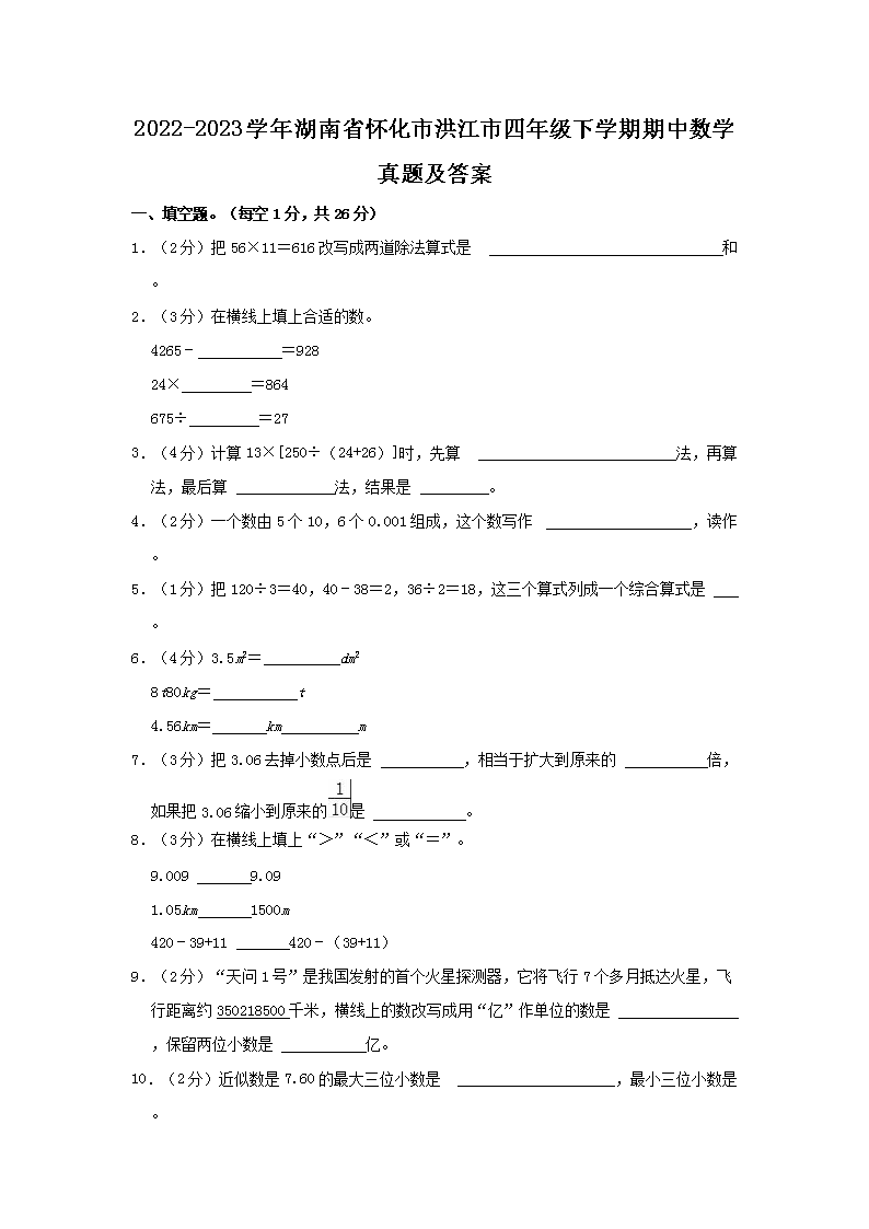 【文档预览】 文档大全网整理发布2022-2023学年湖南省怀化市洪江市四年级下学期期中数学真题及答案(Word版),前五页预览如下: