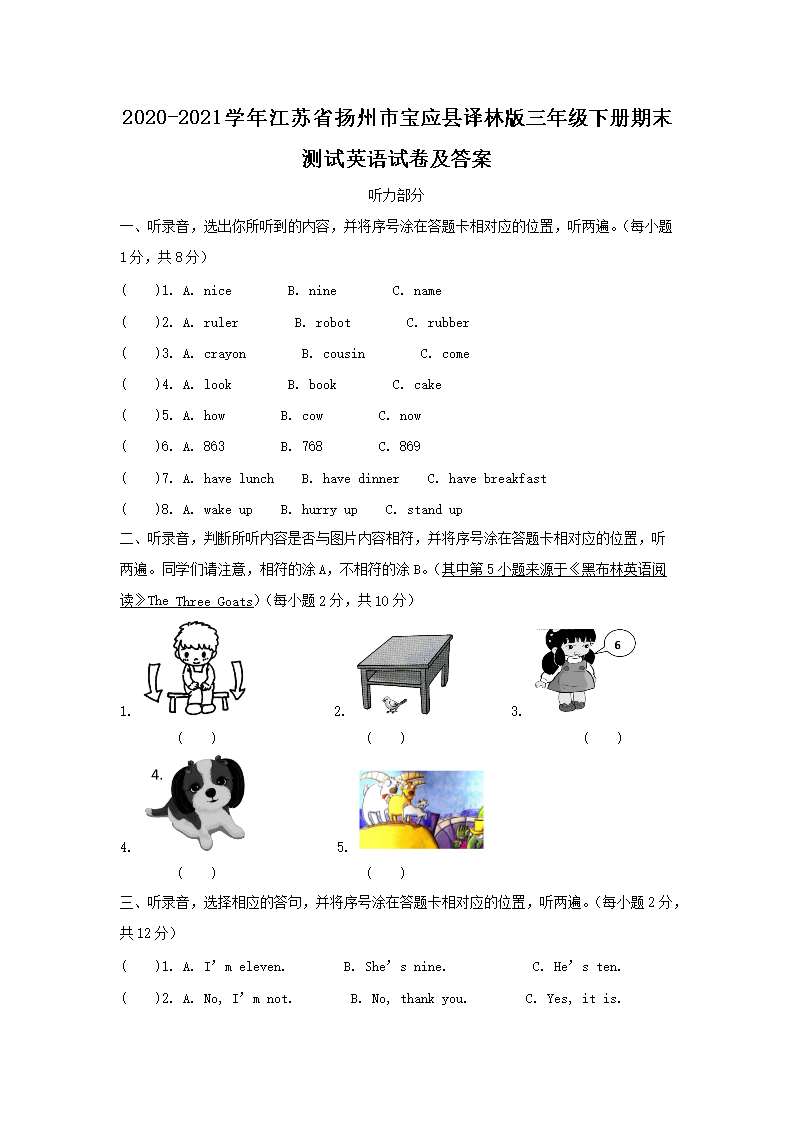 2020-2021学年江苏省扬州市宝应县译林版三年级下册期末测试英语试卷及答案(Word版)08-05