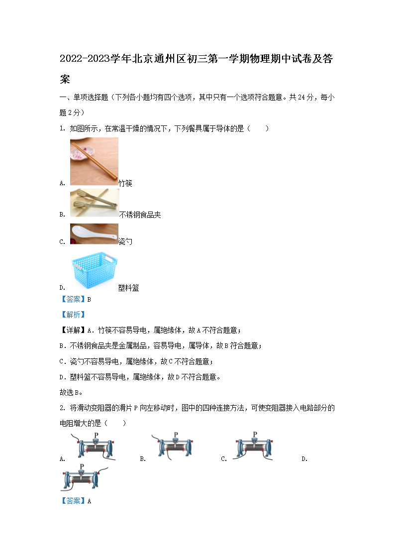 2022-2023学年北京通州区初三第一学期物理期中试卷及答案(Word版)08-08