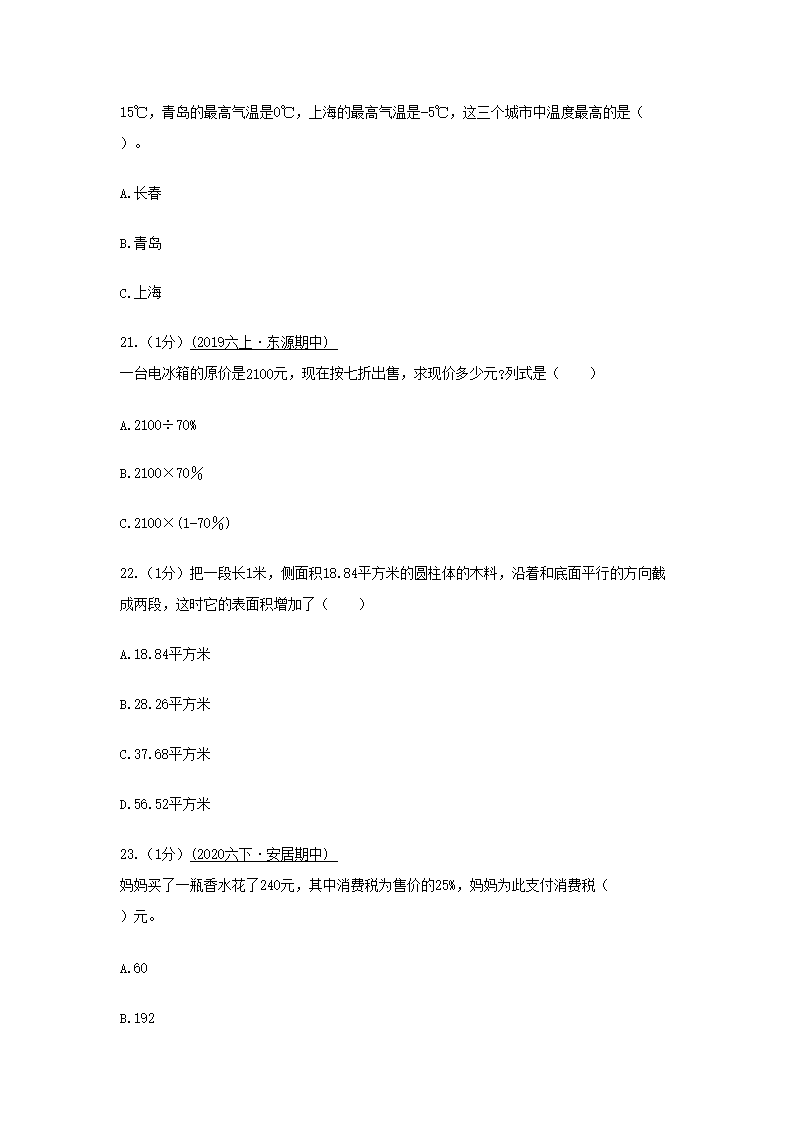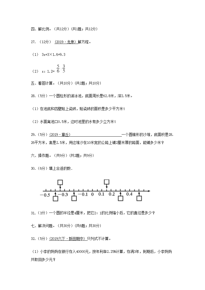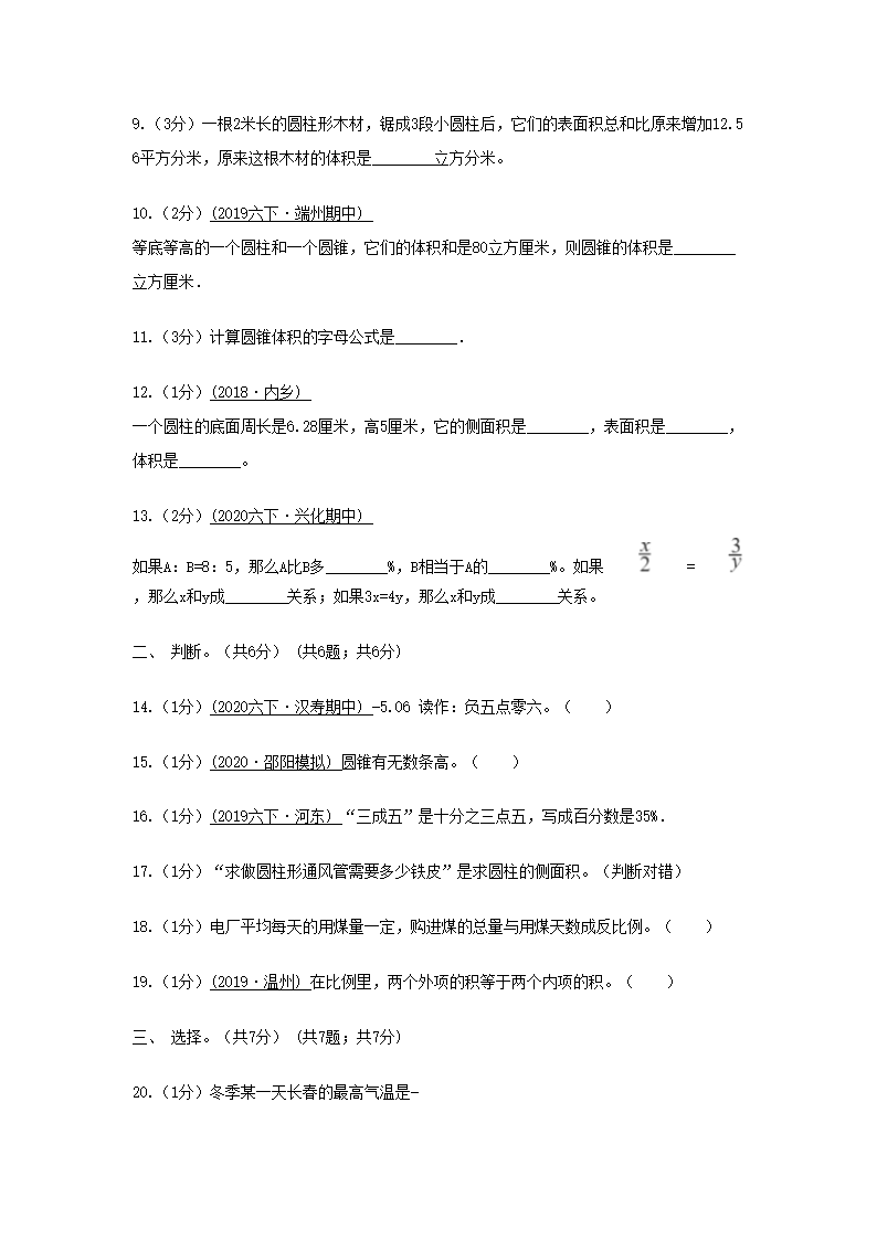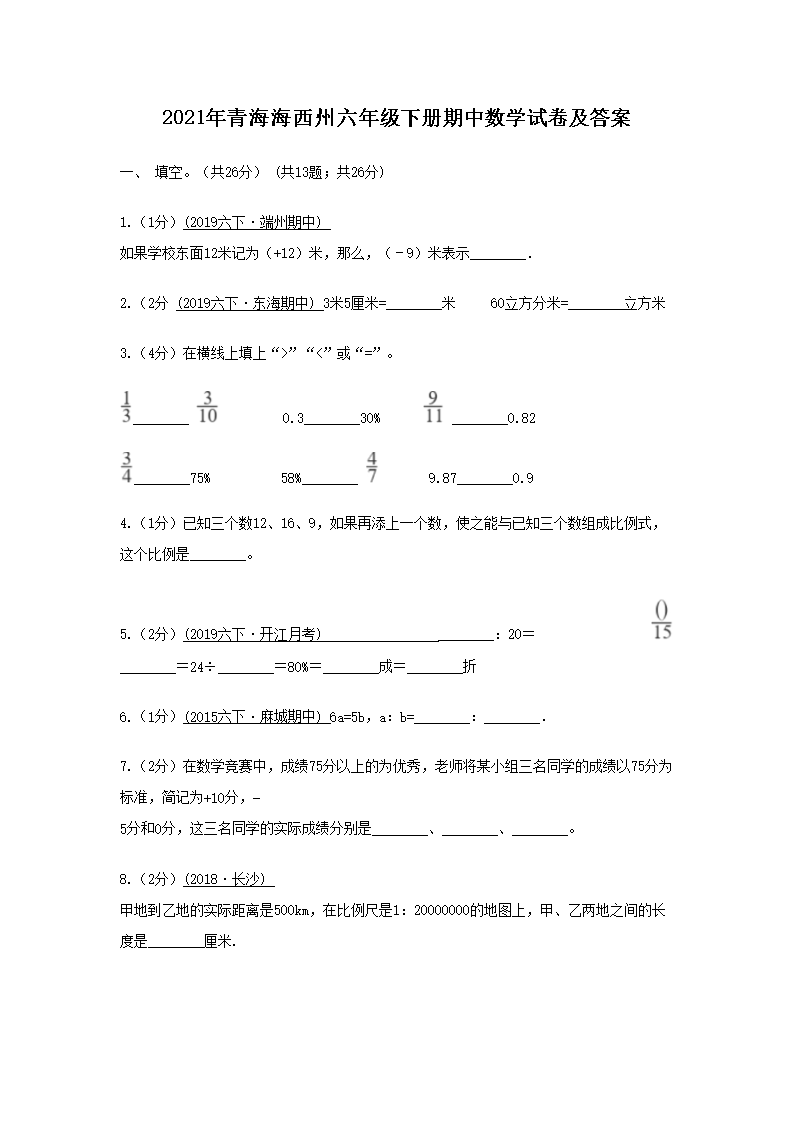 2021年青海海西州六年级下册期中数学试卷及答案(Word版)09-01