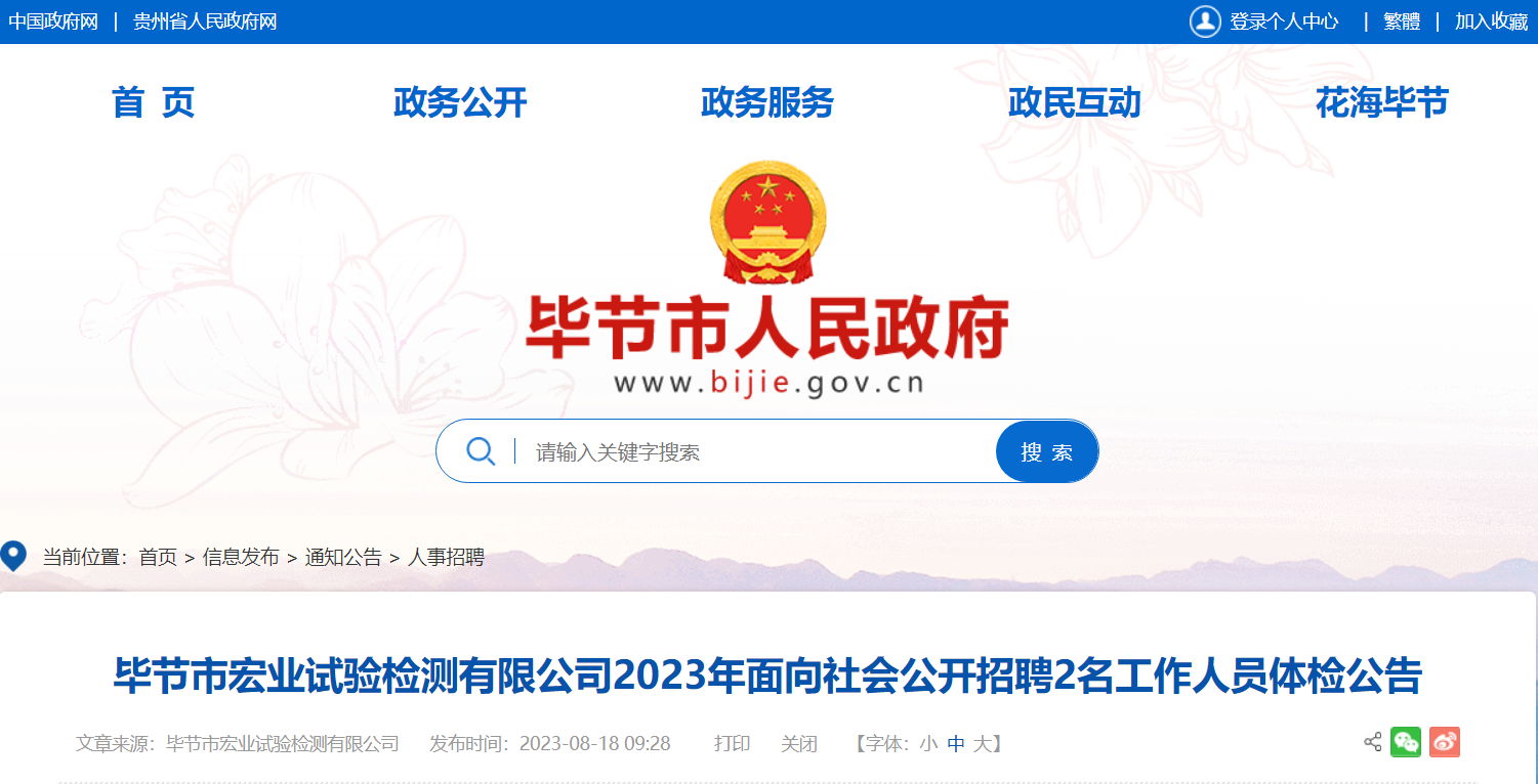 2023年贵州省毕节市宏业试验检测有限公司面向社会公开招聘工作人员2人体检公告08-19