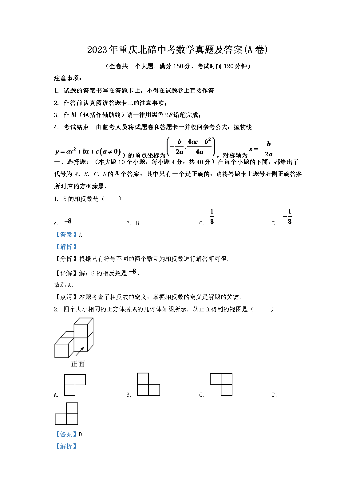 2023年重庆北碚中考数学真题及答案(A卷)(Word版)06-15