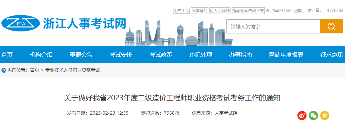 根据省住房和城乡建设厅、省交通运输厅、省水利厅、省人力社保厅《关于印发的通知》(浙建〔2019〕5号)精神,现将我省2023年度二级造价工程师职业资格考试考务工作有关事项通知如下。