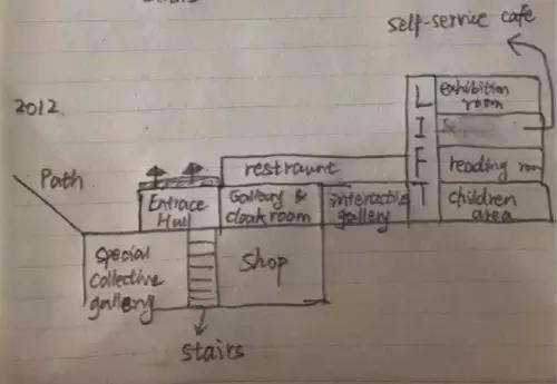 The four years witnessed a considerable change. The entrance, which was a less important part previously, was shifted into a entrance hall. Beside it, the former gallery developed a new affiliated function as a cloak room with a newly-built restaurant located in the northern part. The east side of the museum underwent dramatic changes with only the reading room remaining, while other new zones such as an exhibition room, children area, self-service café and a lift were freshly constructed.