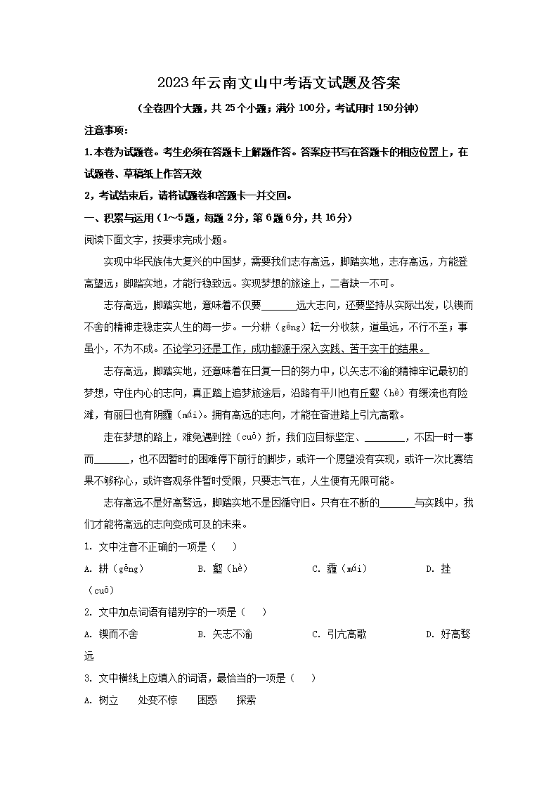 【文档预览】 文档大全网整理发布2023年云南文山中考语文试题及答案(Word版),前五页预览如下: