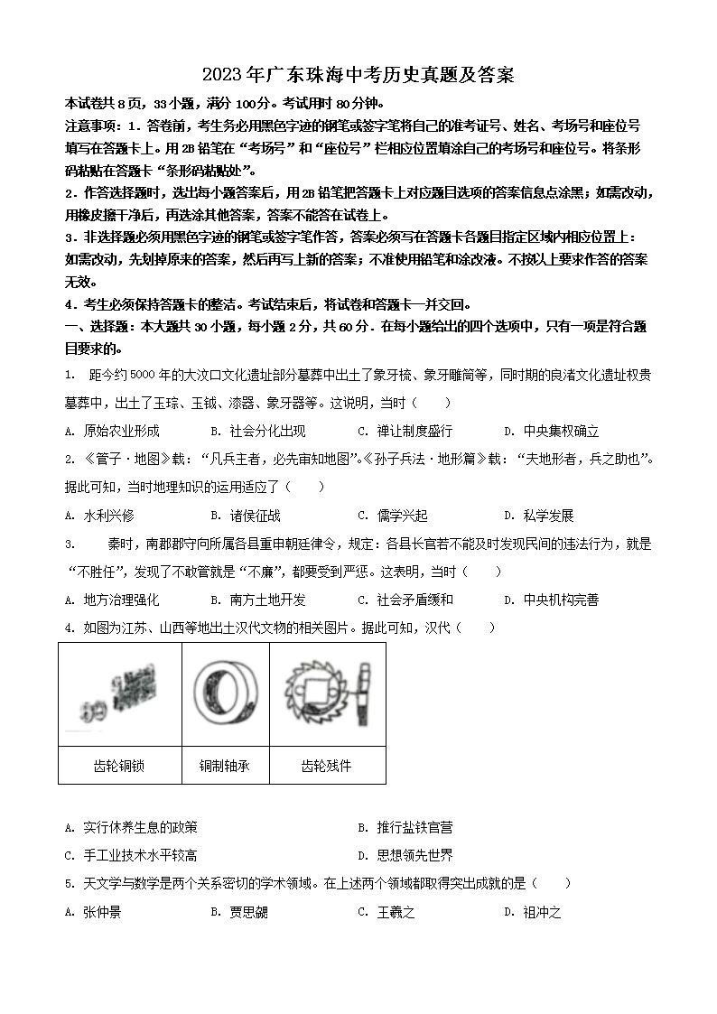 2023年广东珠海中考历史真题及答案(Word版)07-01
