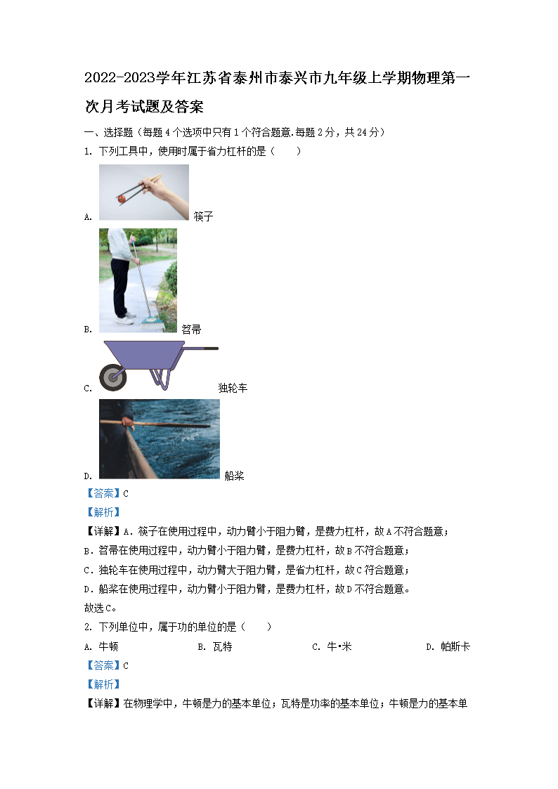 2022-2023学年江苏省泰州市泰兴市九年级上学期物理第一次月考试题及答案(Word版)10-13
