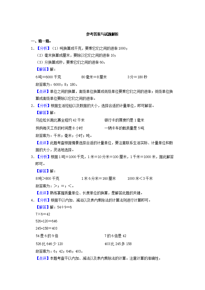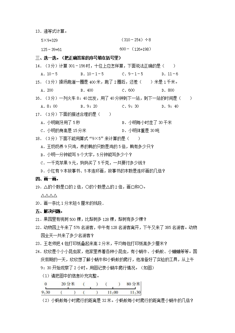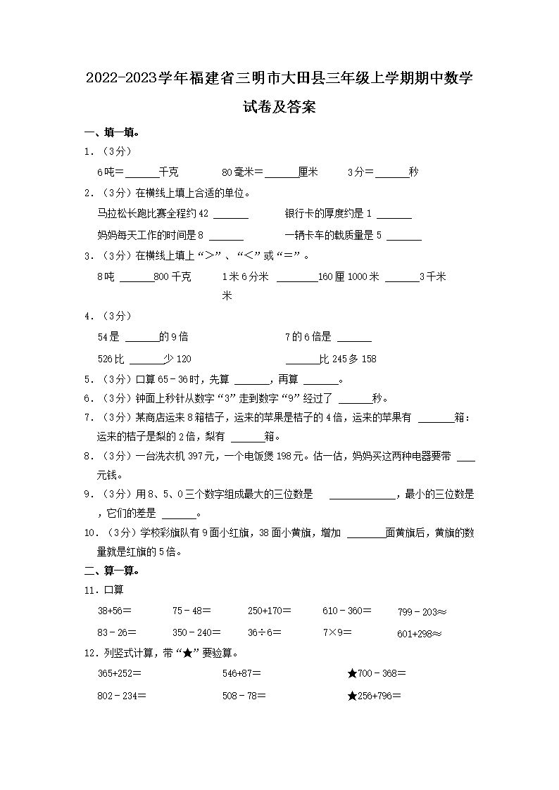 2022-2023学年福建省三明市大田县三年级上学期期中数学试卷及答案(Word版)09-14