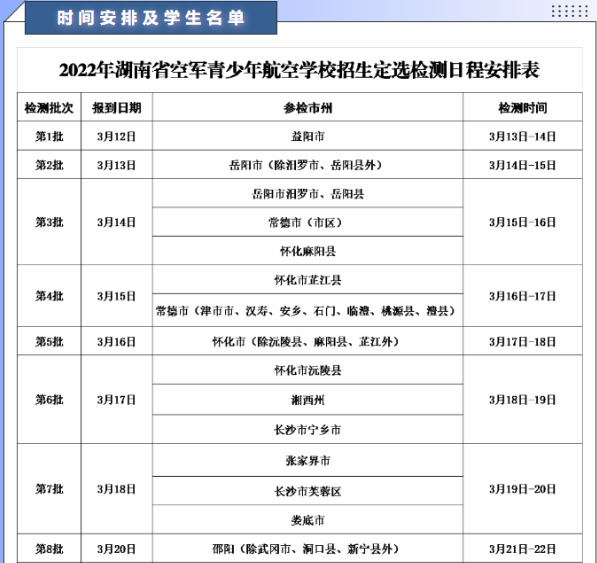 2022年湖南省空军青少年航空学校招生定选检测于3月12日至28日在长沙展开,相关通知和名单已发至湖南省教育部门和学校,请各位同学及时关注。
