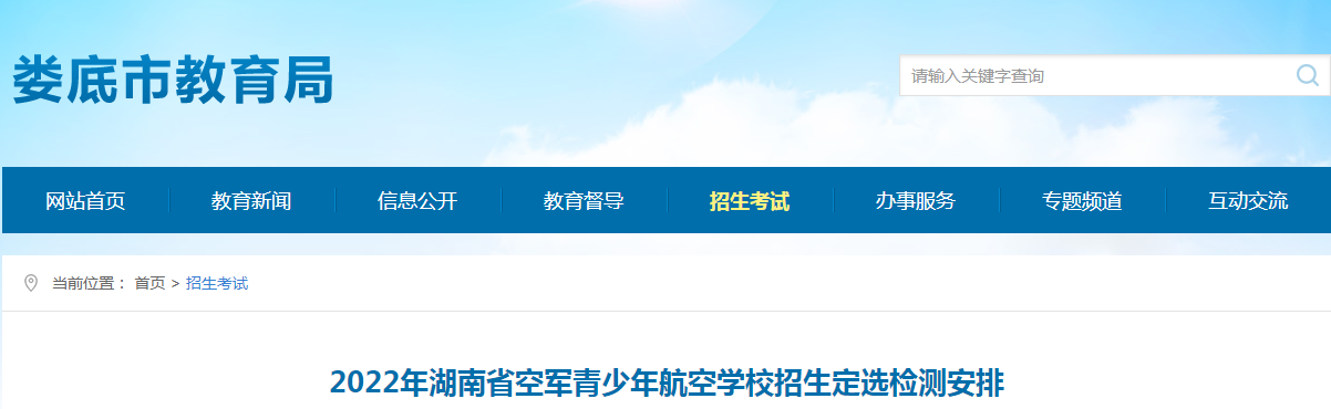 【#中考# 导语】©文档大全网中考频道从娄底市教育局了解到,2022年湖南省空军青少年航空学校招生定选检测安排已公布,详情如下: