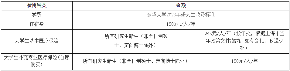 1、学费:按照国家规定,全面实行研究生教育收费制度。具体请见东华大学研究生招生网—信息公开栏—《东华大学2023年研究生收费标准》。