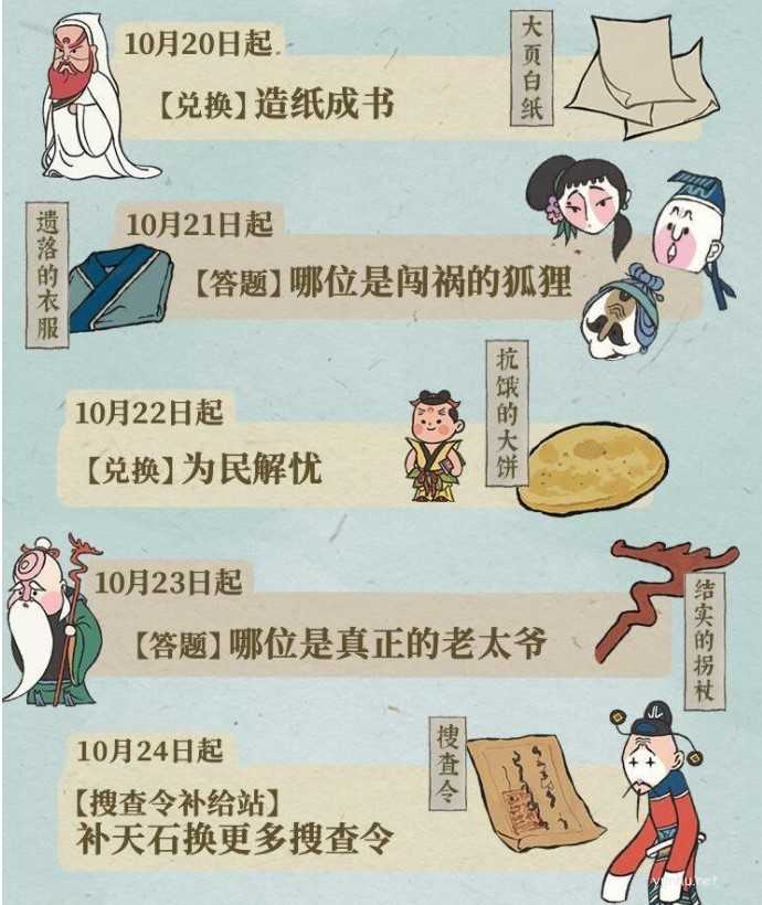 今天只能兑换造纸成书,大家只需要参加天书入世记系列趣味活动就能获得新的道具了。寻找居民的线索,收集物品兑换想要的奖励就完事了,很简单的。