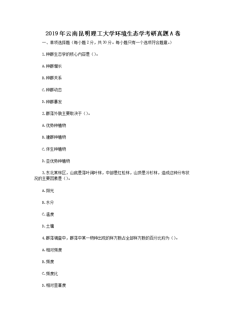 【文档预览】 文档大全网整理发布2019年云南昆明理工大学环境生态学考研真题A卷(Word版),前五页预览如下: