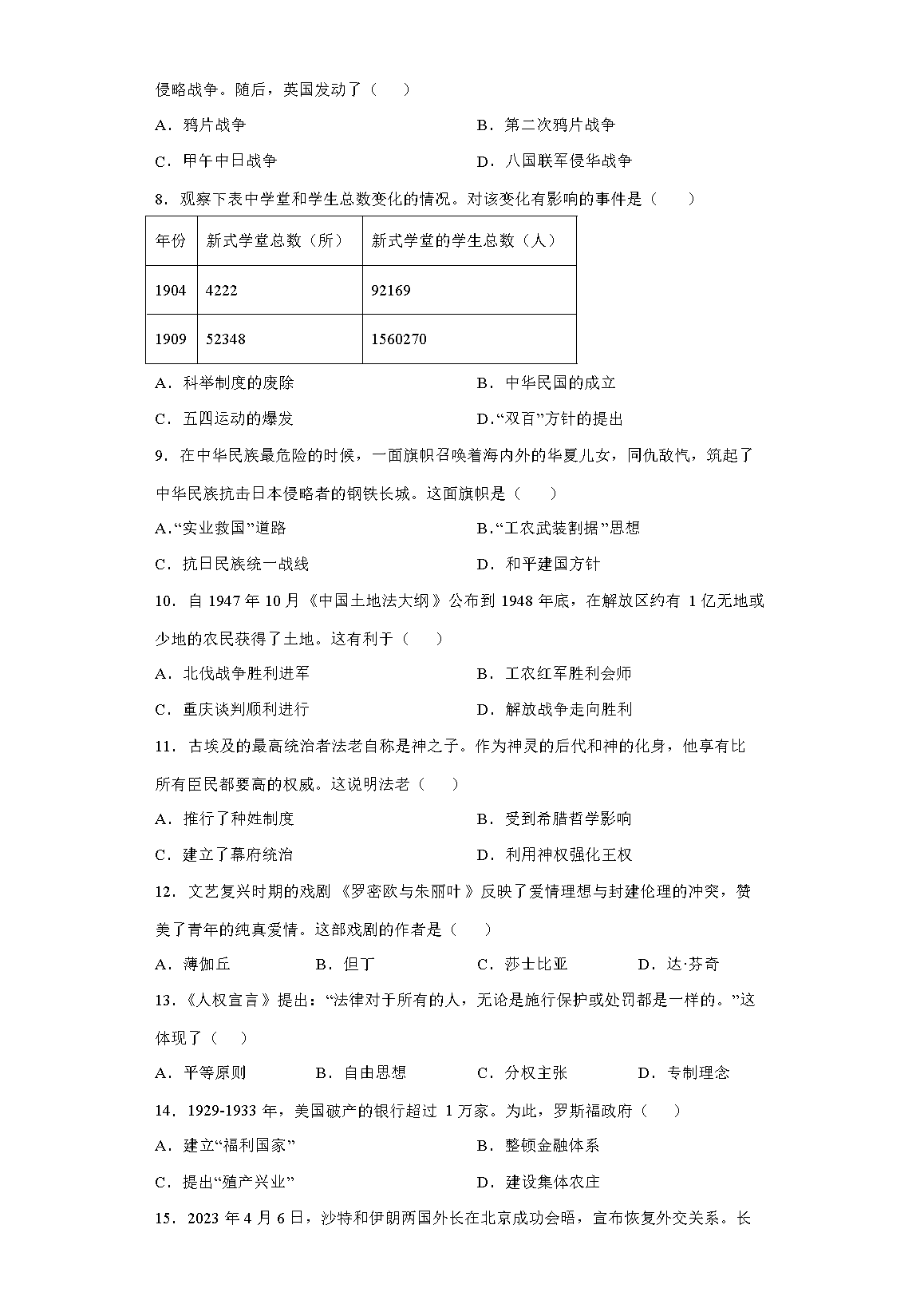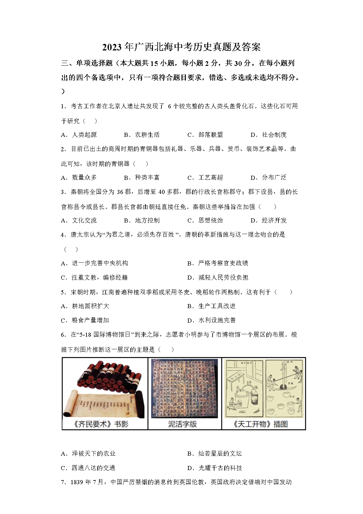 2023年广西北海中考历史真题及答案(Word版)06-30