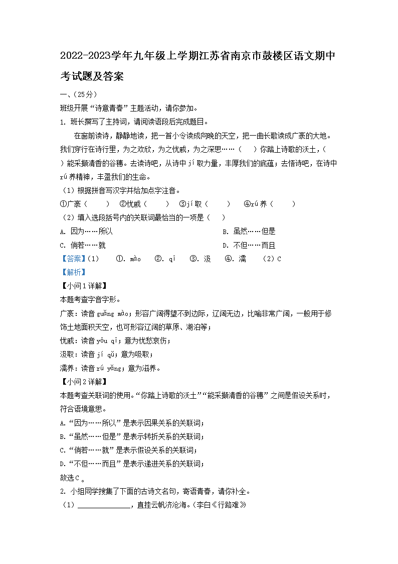 2022-2023学年九年级上学期江苏省南京市鼓楼区语文期中考试题及答案(Word版)09-07