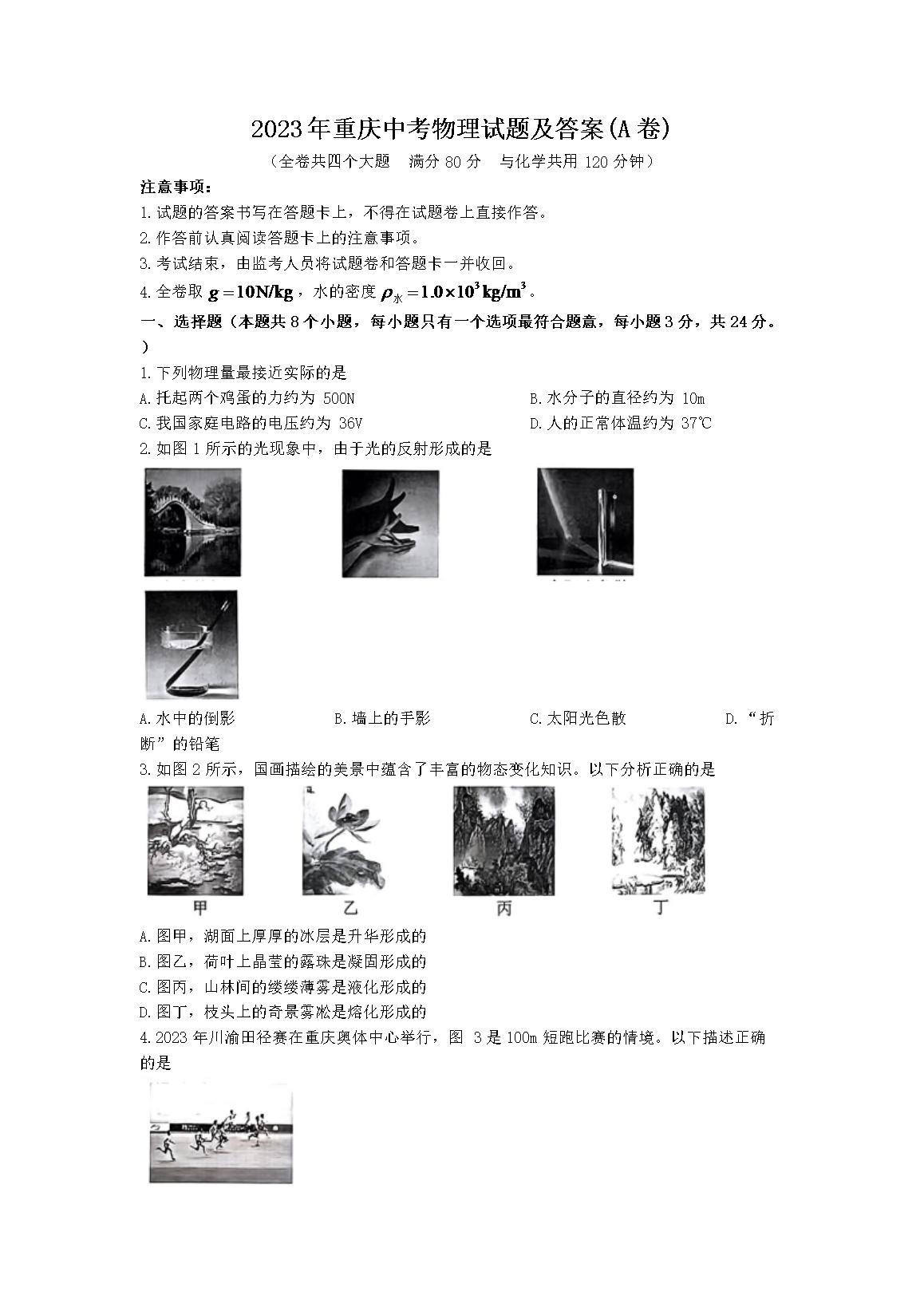 2023年重庆中考物理试题及答案(A卷)(Word版)06-19