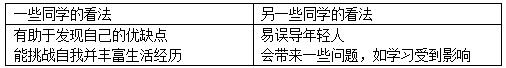 Some of them argue that it offers a good chance for young people to discover their own strong points as well as weaknesses. Meanwhile, it can get them ready for any challenges and enrich their life experiences. However, st)me of my classmates don't think so. They feel that it could mislead those youngsters. Especially to the school girls and boys, it may cause some troubles. For example, it may affect their study badly.