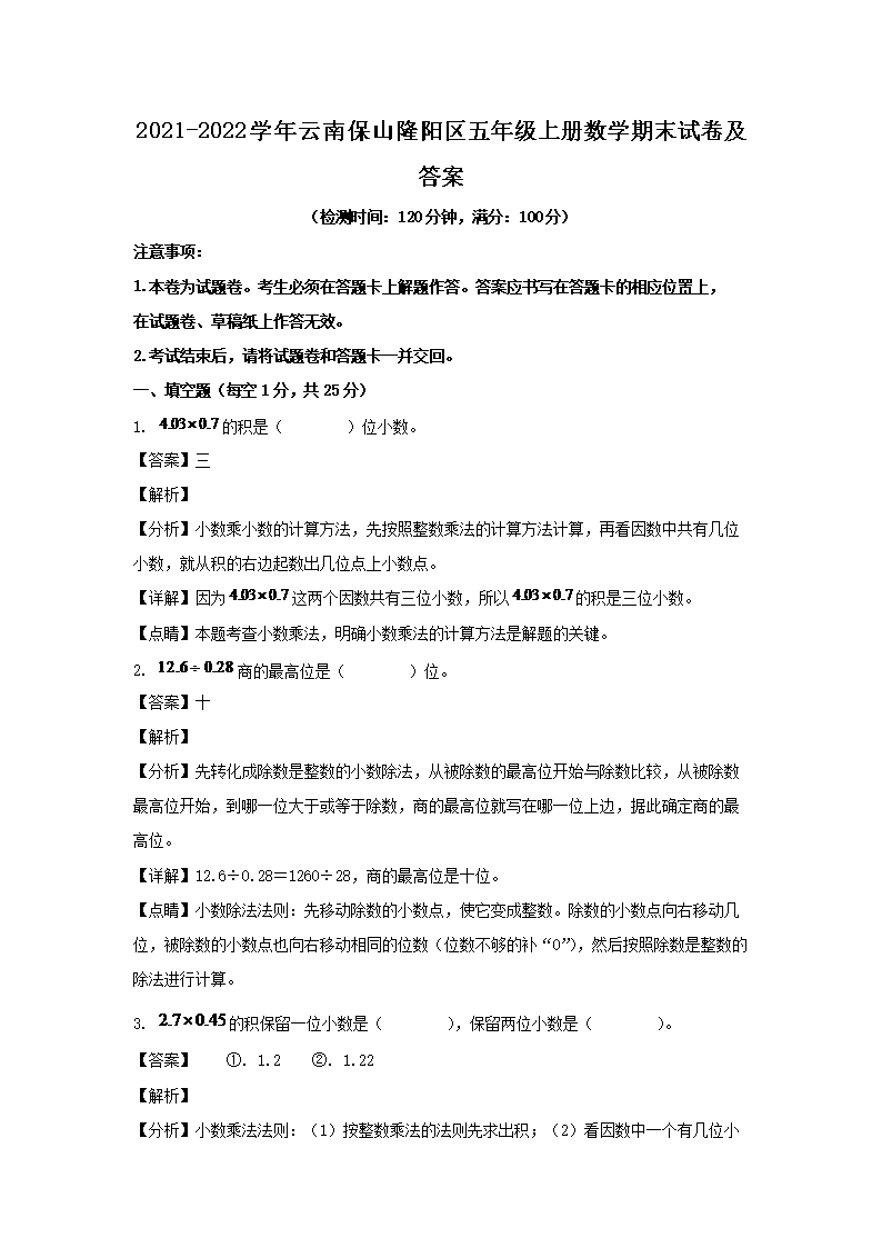【文档预览】 文档大全网整理发布2021-2022学年云南保山隆阳区五年级上册数学期末试卷及答案(Word版),前五页预览如下: