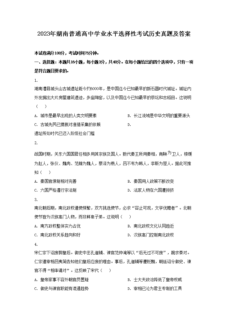 【文档预览】 文档大全网整理发布2023年湖南普通高中学业水平选择性考试历史真题及答案(Word版),前五页预览如下: