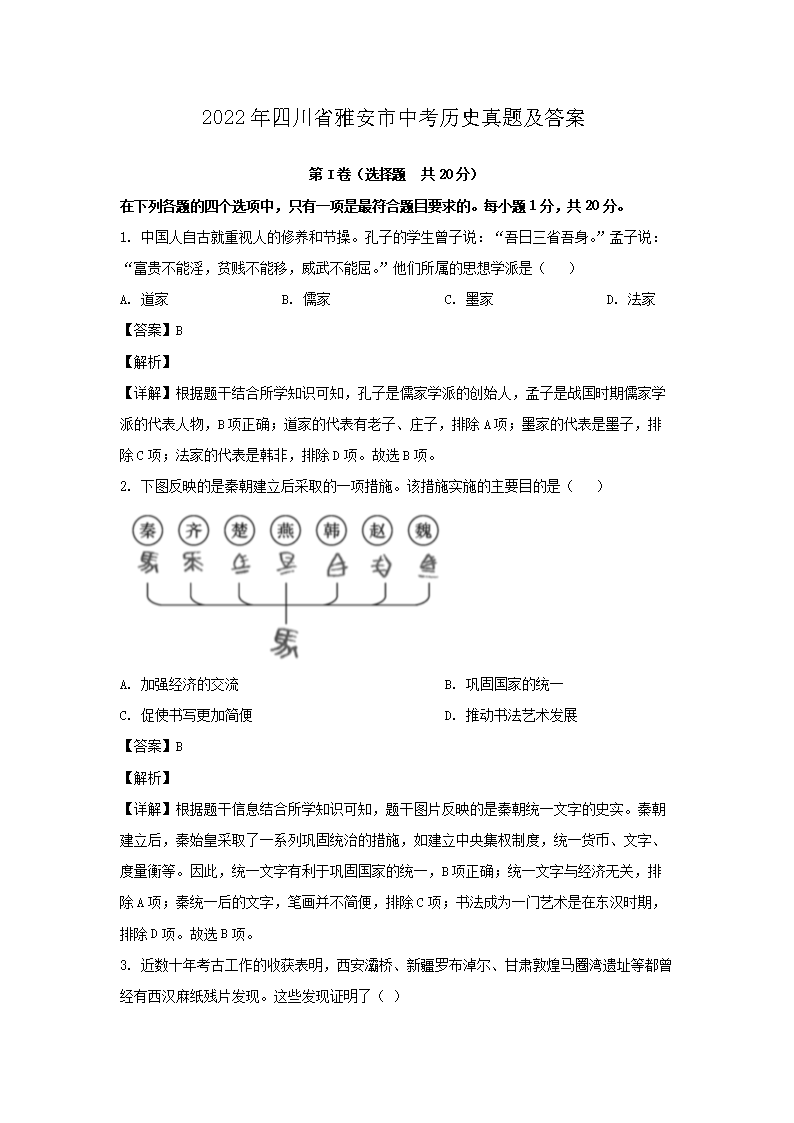 2022年四川省雅安市中考历史真题及答案(Word版)05-27