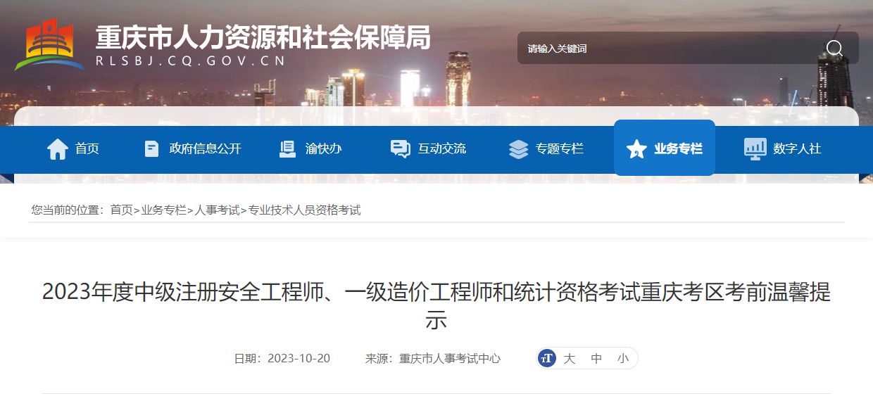2023年度中级注册安全工程师、一级造价工程师和统计3项资格考试将于10月28日、29日举行,为更好服务考生、维护考试公平公正,重庆市人事考试中心温馨提示如下: